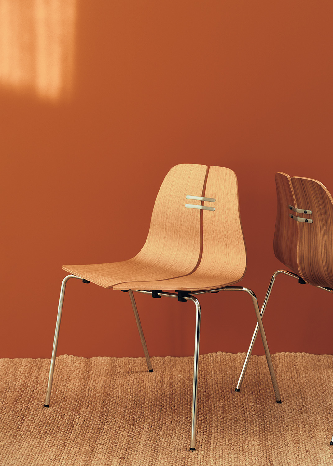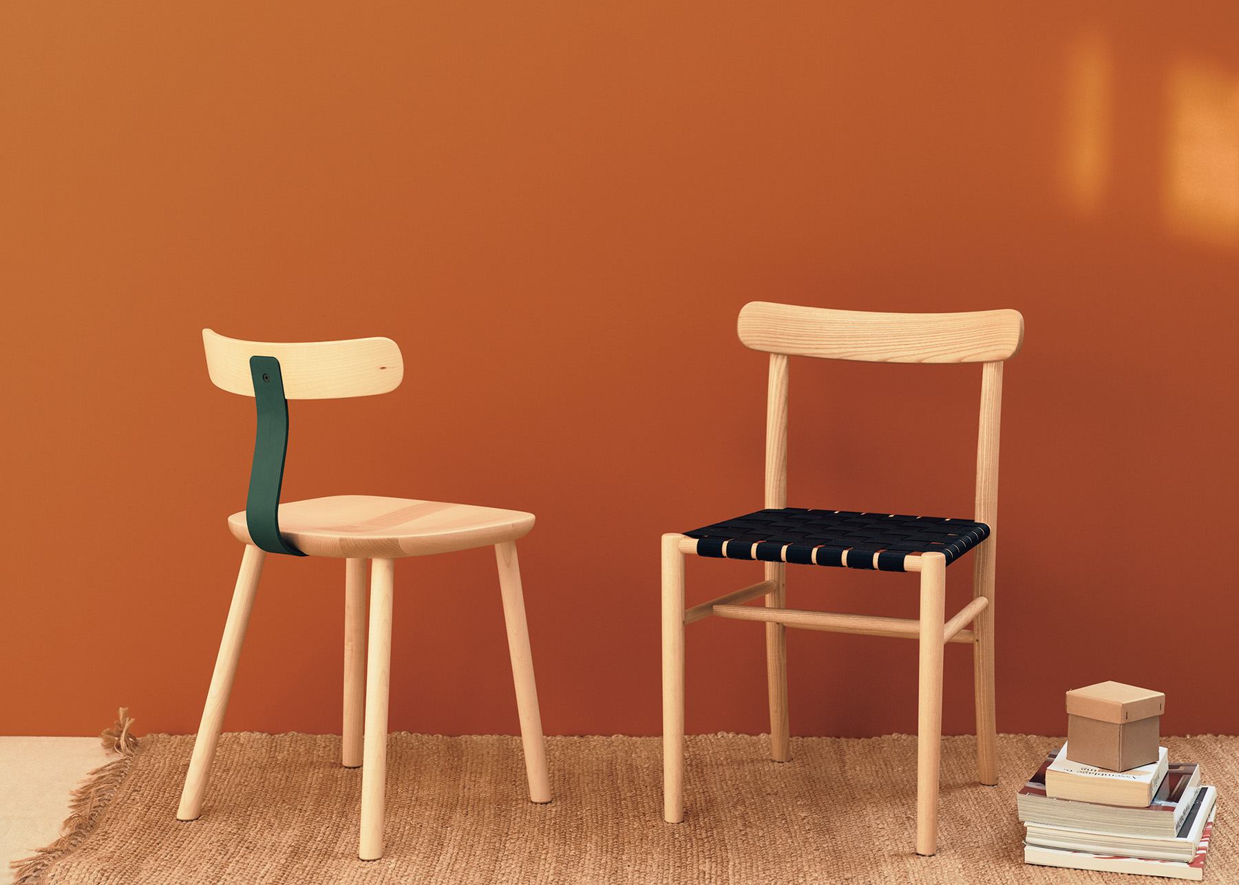 広島の老舗〈マルニ木工〉が培ってきた優れた木材加工技術を背景に、英国デザインの雄、ジャスパー・モリソンが軽やかにエディットした2脚。左が「T&O」、右が「Lightwood」と呼ばれるシリーズで、素朴な表情のウッドに、それぞれスチールとウェビングシートという工業的な異素材を組み合わせ、ポップな佇まいに仕上げた手腕はさすがのひとこと。座り心地も良きかな。左¥74,800、右¥72,600(ともにマルニ木工☎03·5614·6598)