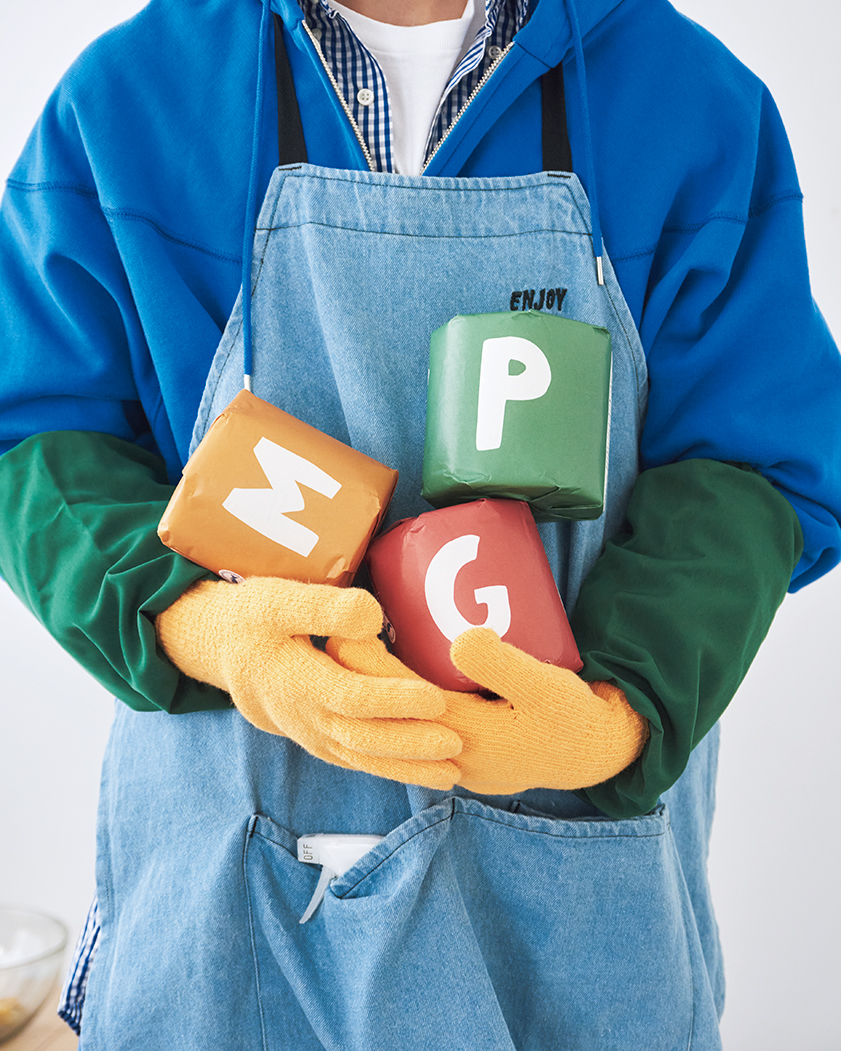 ライトオンスデニム素材のエプロン¥4,950、ポリエステル素材のイージーパンツ¥7,150(ともにVOIRY STORE☎03·6451·0883) ハーフジップのスウェットフーディー¥27,500(ディガウェル/ディガウェル1☎03·5722·3392) ブロードのボタンダウンシャツ¥42,900(インディビジュアライズドシャツ/メイデン・カンパニー☎03·5410·9777) ソックス¥11,000(バウルズ info@vowels.com) Tシャツは私物