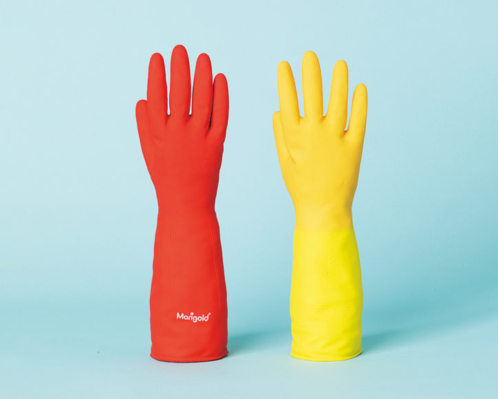 沈みがちなキッチンのいいアクセントになりそうな、英国の老舗メーカー〈マリーゴールド〉のゴム手袋。ロゴの入り方も鮮やかなビタミンカラーも飾りたくなるほどに完璧。右¥828、左¥528(ハンズネットストア hands.net)
