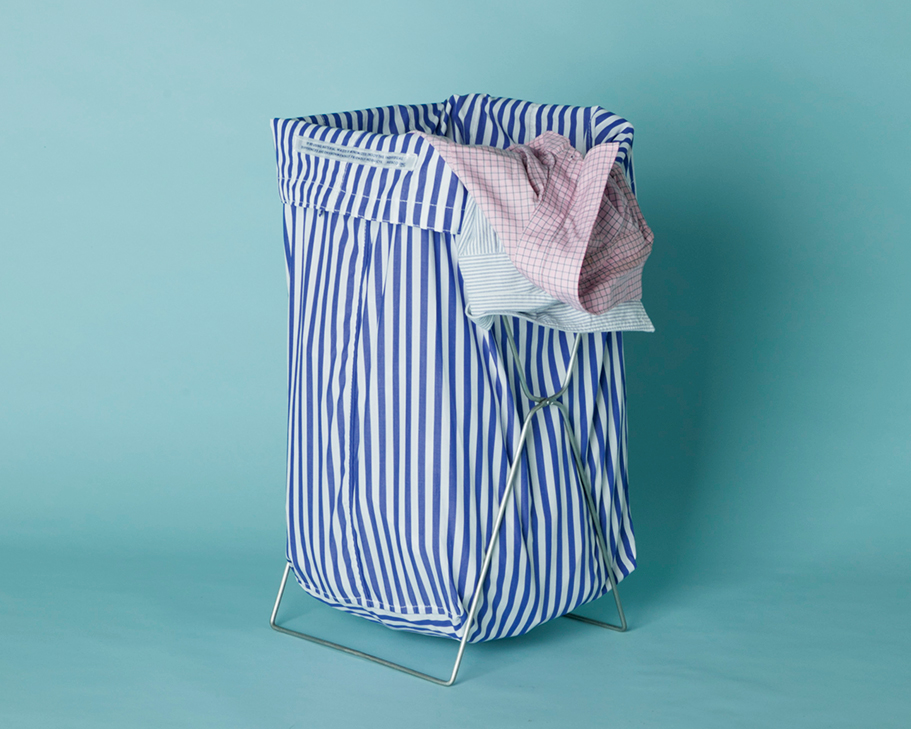 毎日溜まる洗濯物をお洒落に目隠しする〈プエブコ〉の洗濯物用バスケット。爽やかなシャツ地の袋とワイヤフレームのコンビは何度見てもパーフェクトだし、手頃な値段も文句なし。¥6,600(プエブコ☎090·9140·0579)
