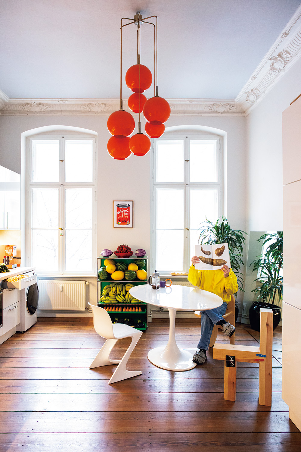 一見シンプルだけど、意外とアイデアが湧くというキッチン。〈USM〉の「USMハラー」に詰め込んだ野菜や果物、窓際にある〈パンプシェード〉のバゲットランプなど、思わずクスッと笑ってしまうネタがちらほら。「最近は野菜や果物にハマってるから、自宅で実験的にインスタレーションをしたり、目の届くところに置いてるんだ」。スペースエイジな照明やテーブル、椅子は、元カノからもらったり、eBay Kleinanzeigenで購入した中古アイテム。
