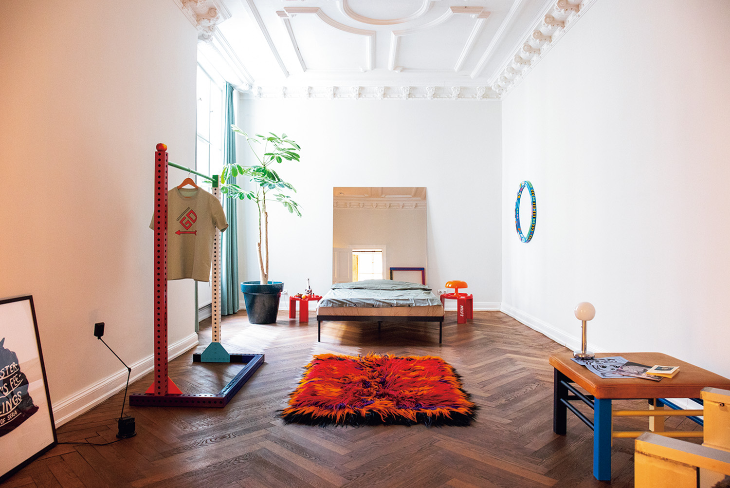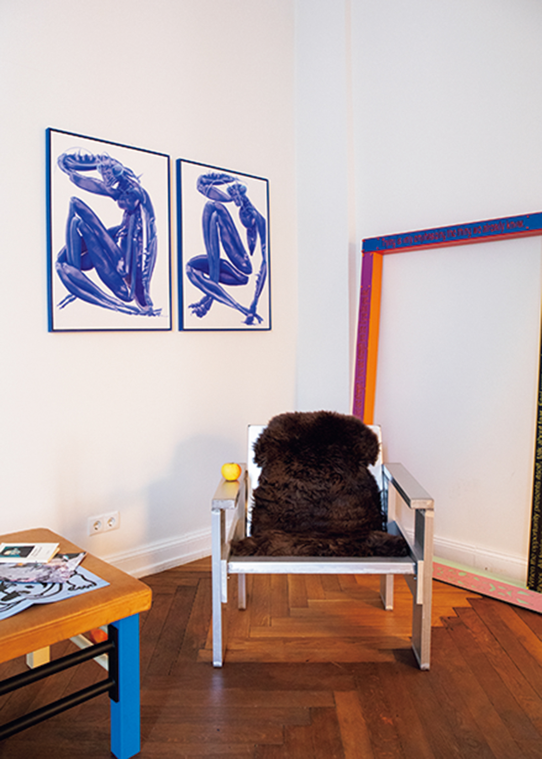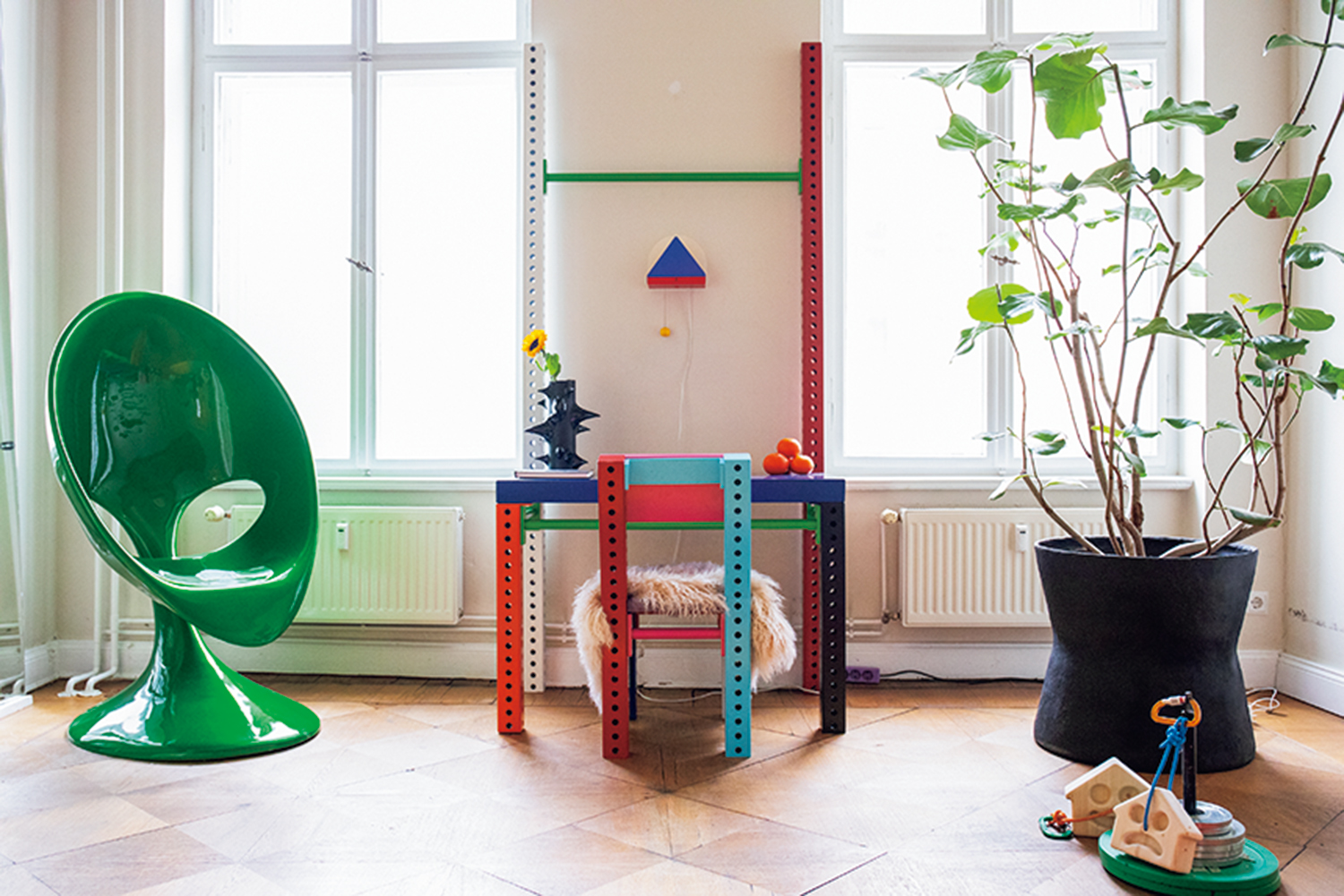 懸垂バーとしても機能するワークデスクと椅子は仲良しのアーティスト、ニック・コスマスの作品。「彼がベルリンを離れる際に譲り受けたんだ。体操にインスパイアされたカラフルな家具で気分が上がるよ」。壁にはエットレ・ソットサスがデザインした〈イケア〉のウォールランプ。 エイリアン型の「ZENOMORPH chair」は、2023年に「Sucuk und Bratwurst」がミラノサローネで発表したもの。