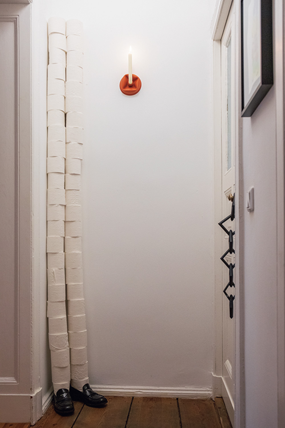トイレ前にあるラバーカップを改造したキャンドル立ては、ネットで見つけたアイデアを自作。コーナーにはローファーを履かせたトイレットペーパータワー。「ストックは必要だし、簡単だからおすすめ」