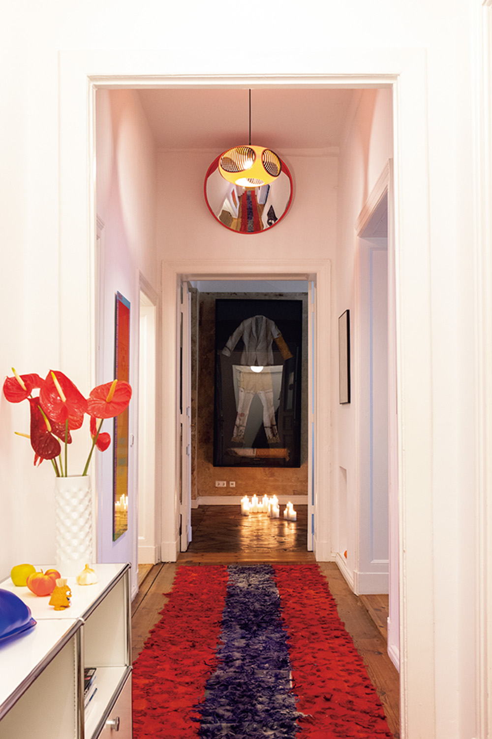 リビングへと続く廊下には、「Sucuk und Bratwurst」の作品を展示。照明はルイジ・コラーニのUFOランプ。道路で使用されるカーブミラーをインテリアとして活用。