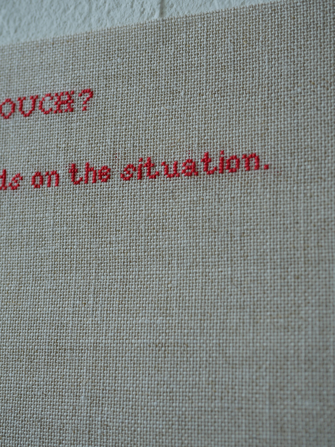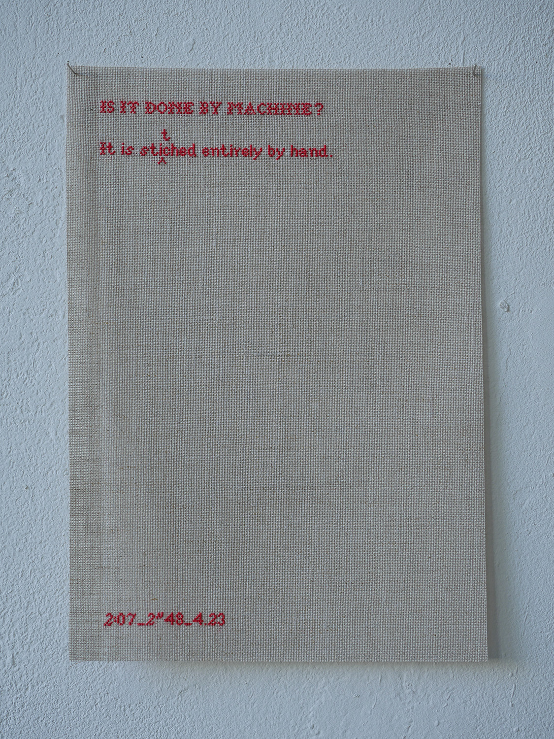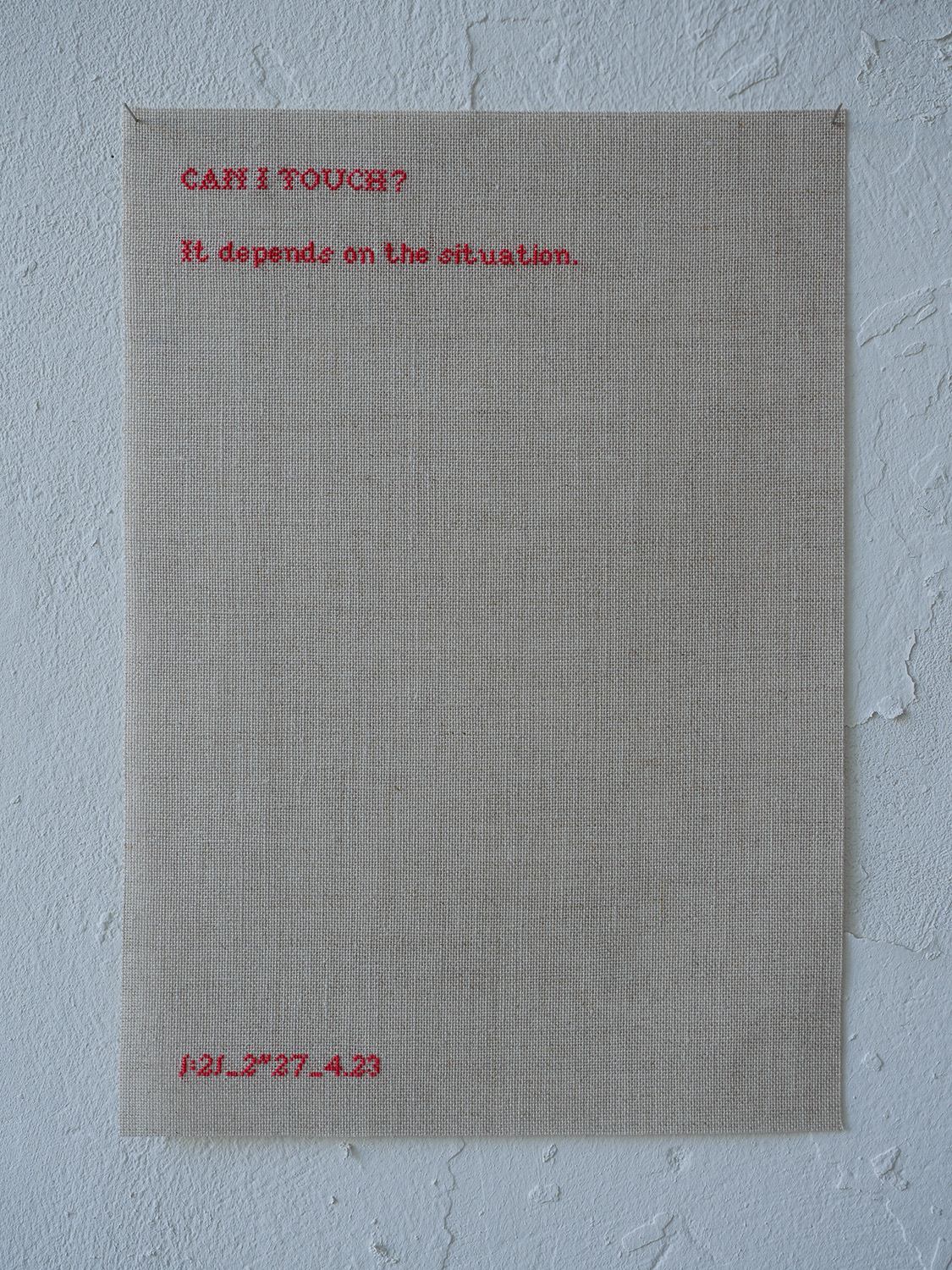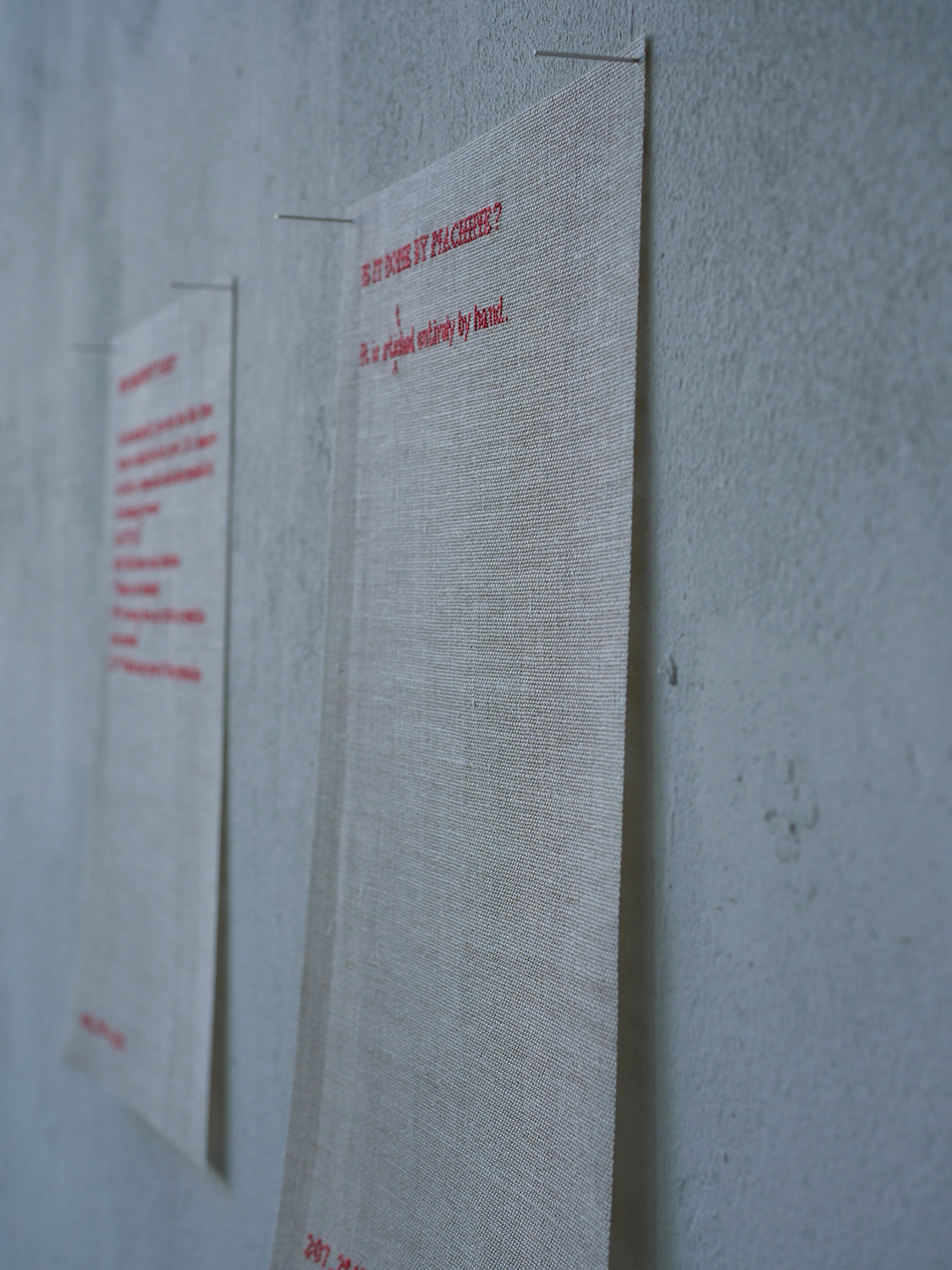 ウェブサイトやウェブショップのカスタマーサービスの質の向上や効率化を目的に設けられる「よくある質問コーナー」で、答えがなかなか見つからずイライラなんていう経験、誰しも一度はあるのではないでしょうか。 ある時から刺繍の作品や活動に対して受けるコメントや質問の中に、似たものが多いことに気づく、というか少し気になるようになりました。それらを整理して、自分の見解を返答としてまとめてみようと始めたのがFAQ(Frequently asked questions)というシリーズ。A4サイズのリネンの布に「よくある質問コーナー」のフォーマットにならい質問とそれに対する回答を赤い糸でクロスステッチする作品です。