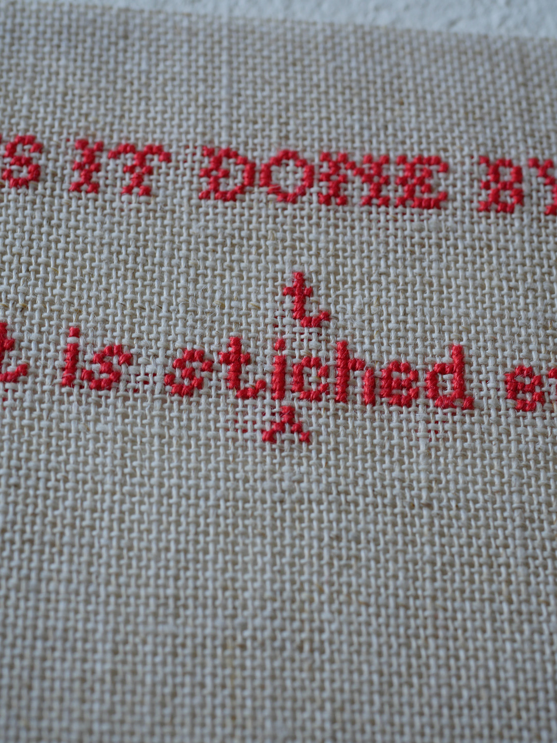 特に布地の目のカウントに基づいた技法を使ったものに聞かれることが多いこの質問。 返答文中のstitched をstiched とスペルミスしていたことに刺し終わった後に気づきましたが、「人間らしい」間違えはこの返答にピッタリじゃないか?ということでそのまま。後付けで英語での修正の仕方を参考にtを付け足しました。