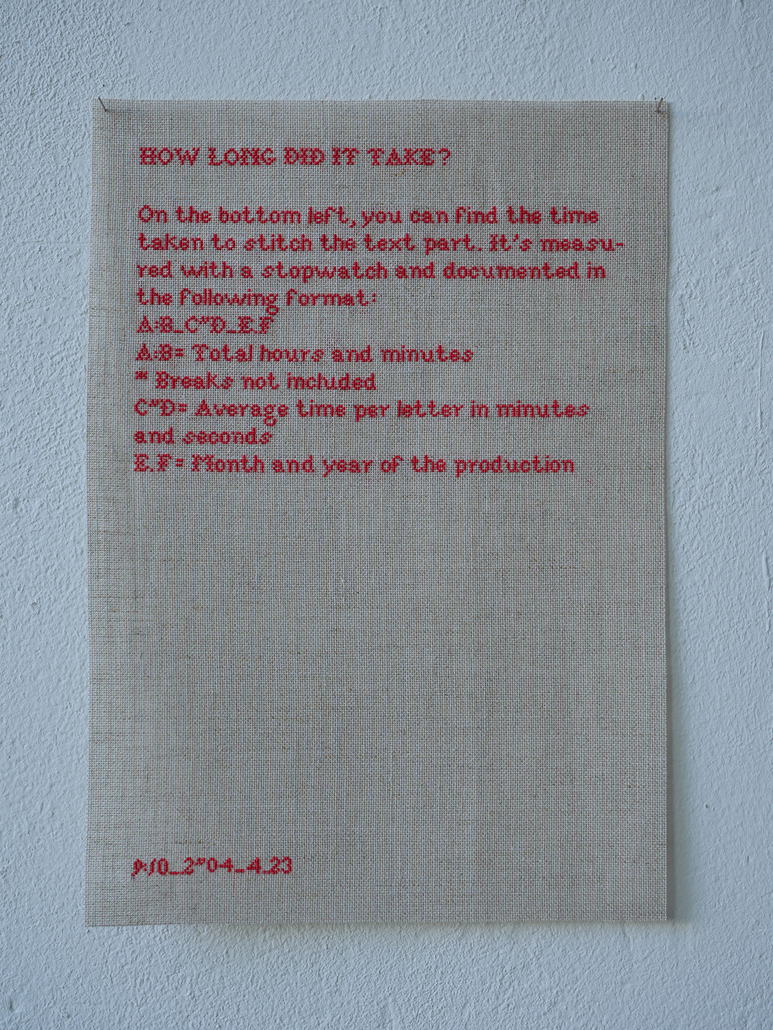 On the bottom left, you can find the time taken to stitch the text part. It’s measured with a stopwatch and documented in the following format: