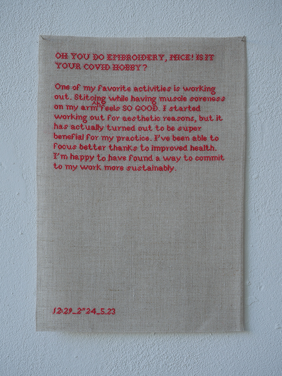 筋トレが趣味の一つです。腕に筋肉痛を感じながら刺繍をするのが、それはもう気分が良い。見た目の為でしたが、いざやり始めると刺繍の活動に非常に良い影響があることに気づきました。以前より健康的な生活になったことで集中力が高まり、より持続性の高い形で活動にコミットできるようになり嬉しく感じています。
