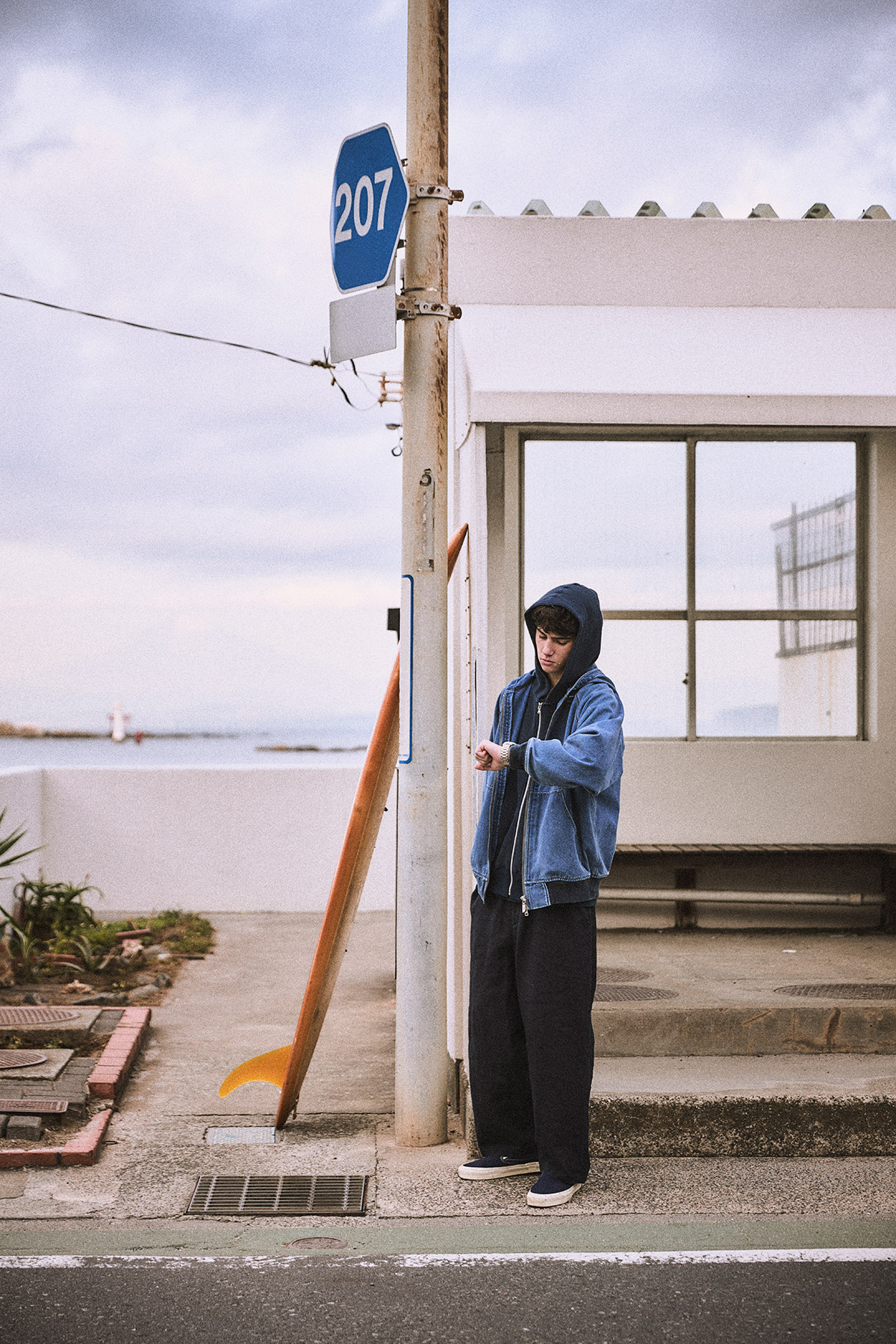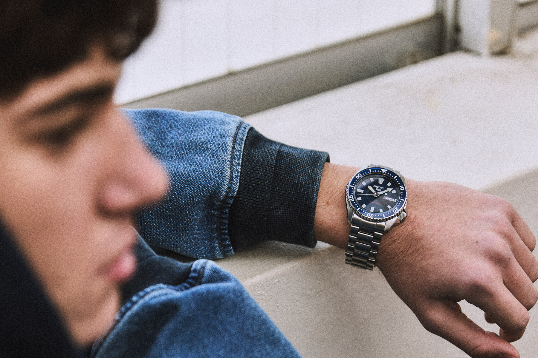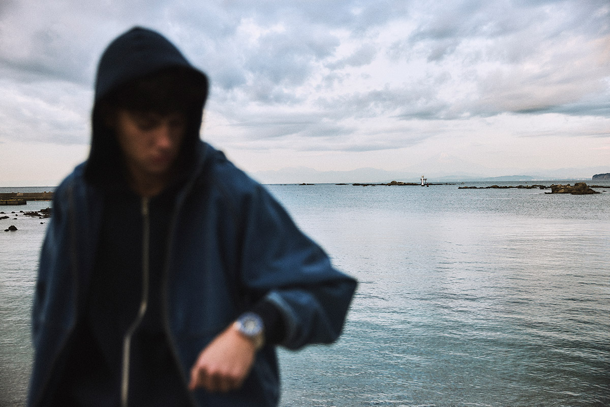 なんて空想に耽っては、「セイコー5 スポーツ」をもう一度見やる。時間の確認のためではない。僕が巻き付けるこの時計は何度も視線を送りたくなるほどかっこいいからだ。「セイコー 5スポーツ」と一口に言っても、色々シリーズが存在する。このモデルは「SKX007」をルーツに持つ「SKX series」の一本。そのそのデザインのDNAを受け継ぎながら、現代のライフスタイルに合わせてアップデートされたモデルだ。何がいいって、マリンを想起させる青い文字盤と艶感のあるベゼル。ケース径42.5mmのボリュミーなサイズ感も男らしくて、今日のネイビーを基調にしたタフなアウトフィットにもハマってくれるのだ。それに……あっ、バスが来た! 短時間じゃ語りきれないな。