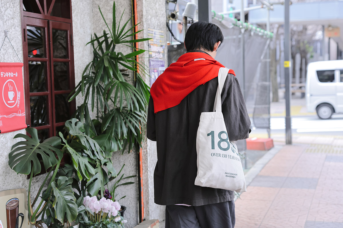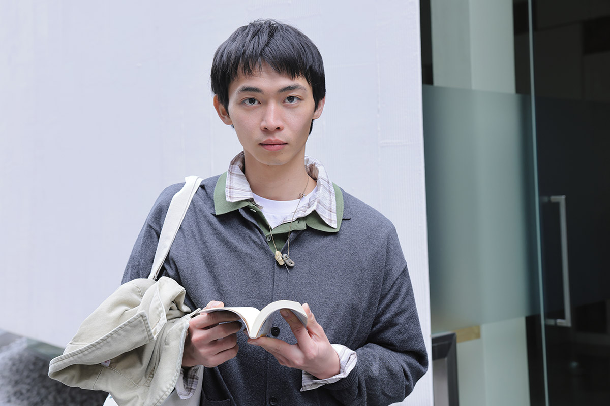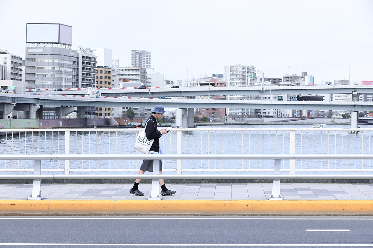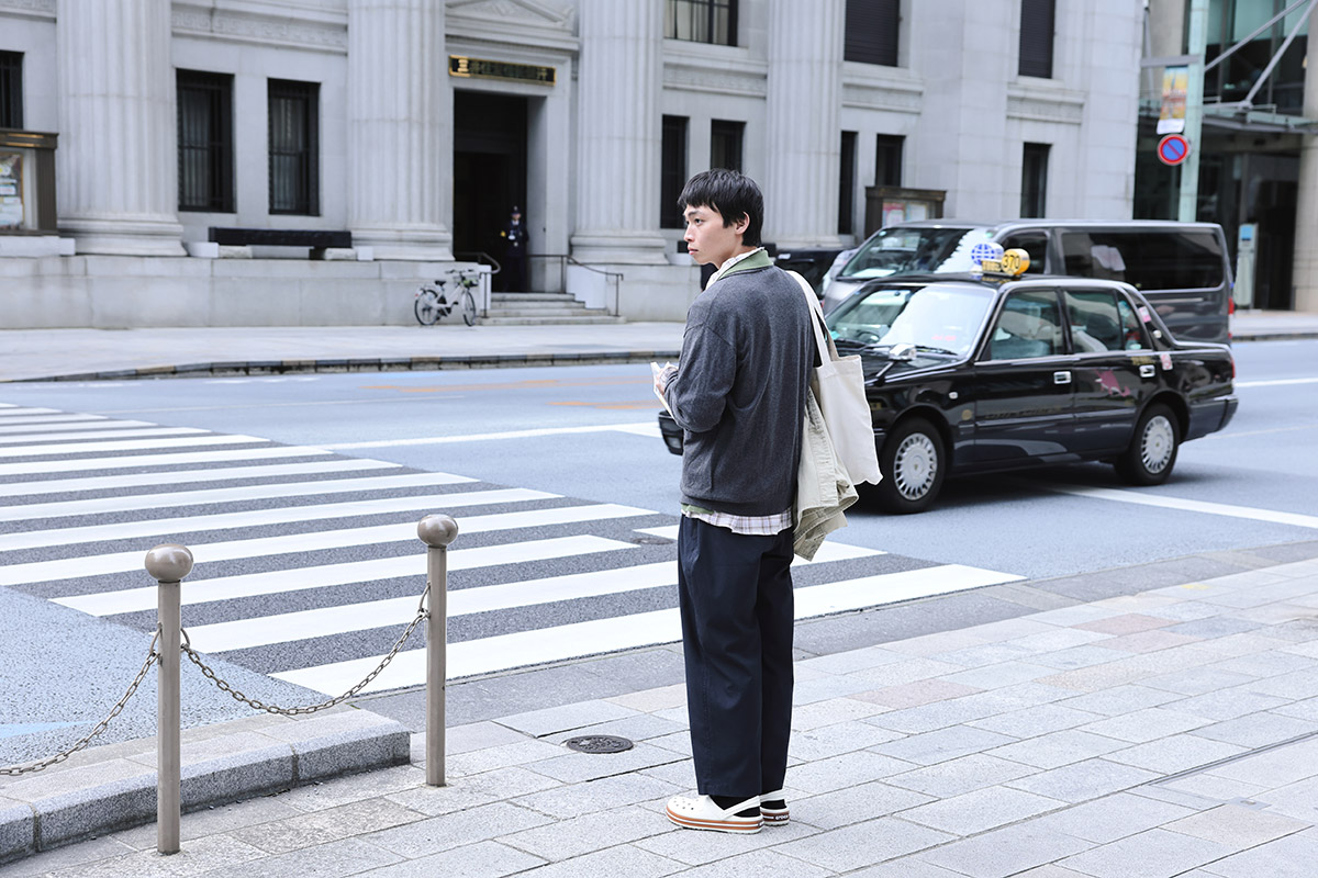 クロックバンド ガム クロッグ¥8,800(クロックス/クロックスカスタマーサポート☎ 0120•55•9694) シルクカシミヤのカーディガン¥38,500(フォル/ジャーナル スタンダード 渋谷スクランブルスクエア店 ☎ 03•6434•1097)中に着たユーズドのラコステのポロシャツ¥4,950(原宿シカゴ 神宮前店☎ 03•5414•5107) チェックシャツ¥24,200(オブザーブ/ソウ ナカメグロ☎ 03•6416•5549) サッカーイージーパンツ¥23,000(プロップスストア☎ 03•3796•0960) 手に持ったワークジャケット¥64,900(イシューシングス issuethings@gmail.com) Tシャツ、トートバッグ、ソックスはスタイリスト私物、ネックレスはモデル私物