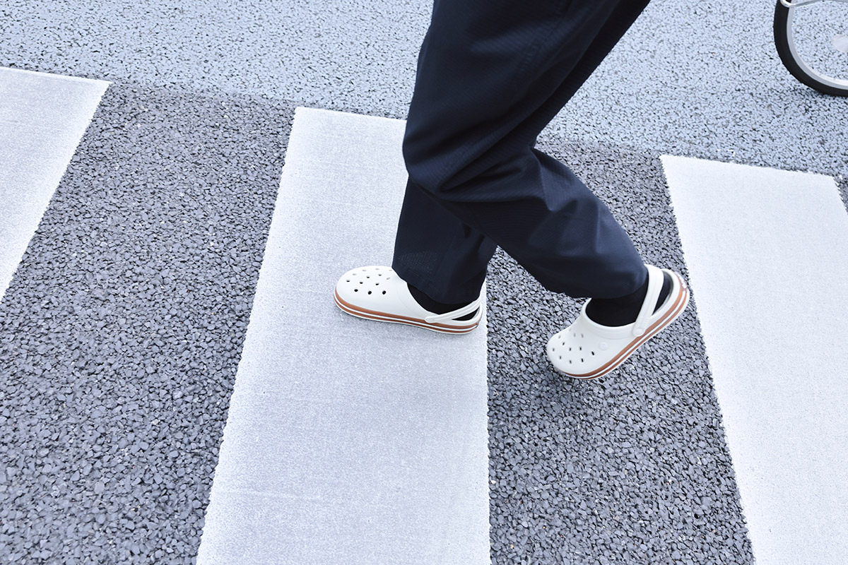 クロックスの中でもアイコニックな存在のひとつが「クロックバンド ガム クロッグ」。ラバーゴムを巻いたデザインはシティにも馴染む。
