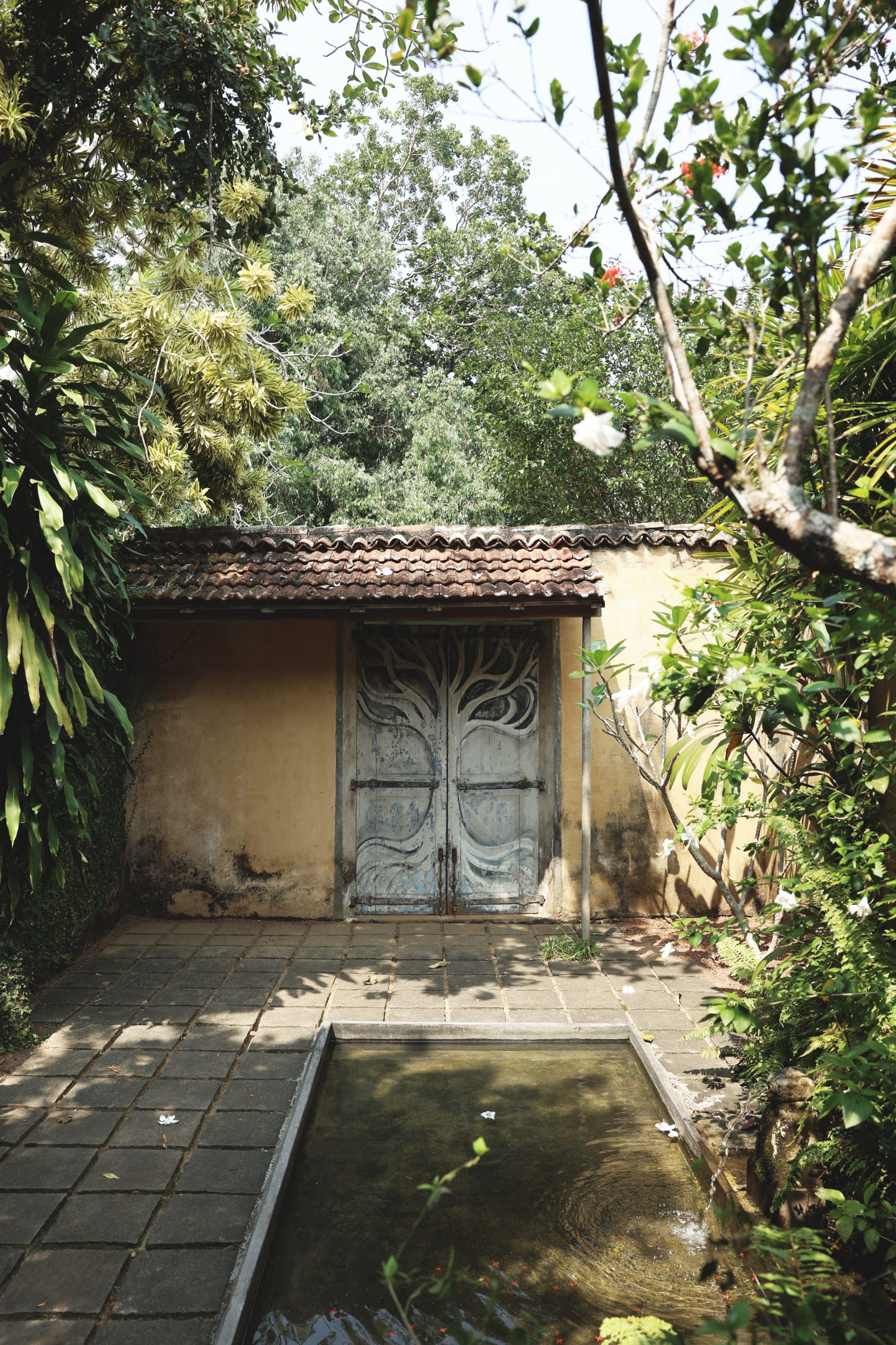 My first stop was Lunuganga, Bawa’s former country estate in Bentota, set on a peninsula overlooking Dedduwa Lake. Surrounded by lush gardens carefully shaped by the architect over decades, the property now operates as a small retreat with only a handful of rooms. I had the privilege of staying in Bawa’s own bedroom, which includes a private pool and terrace opening toward the landscape. It was a rare and intimate way to experience his philosophy, where architecture quietly frames nature rather than competing with it.