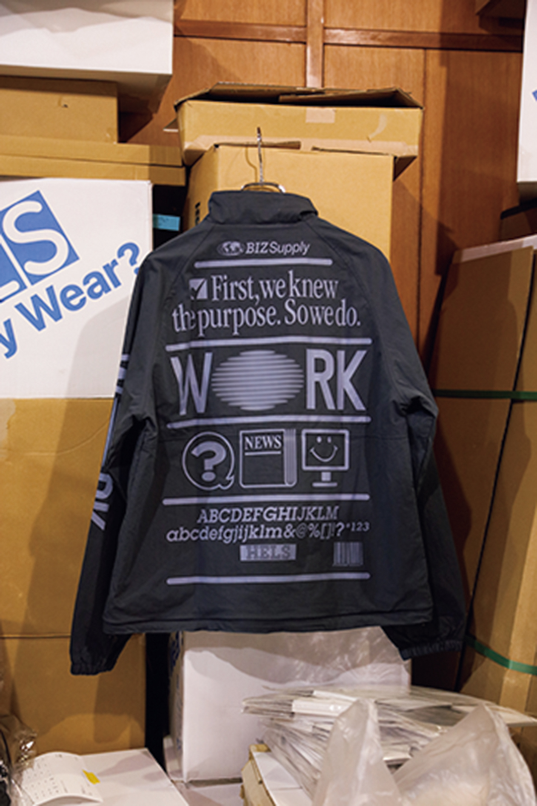 企業ロゴのようにも見える、ヴェイパーウェイヴ的なグラフィックが印象的なトラックジャケット。「運動するように働くトラックジャケット」がテーマで、よく見ると「自分が好きなことのために働くことほど楽しいことはない」という意味合いの言葉がデザインされている。¥19,800