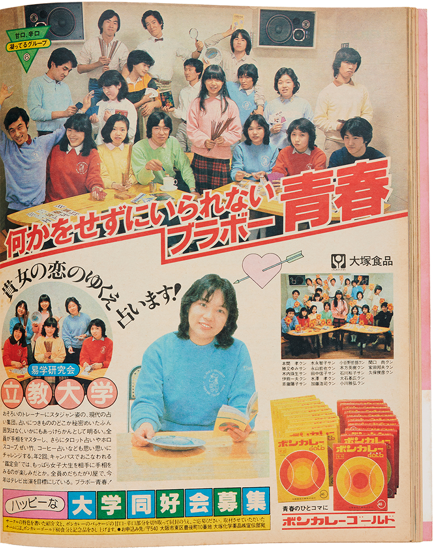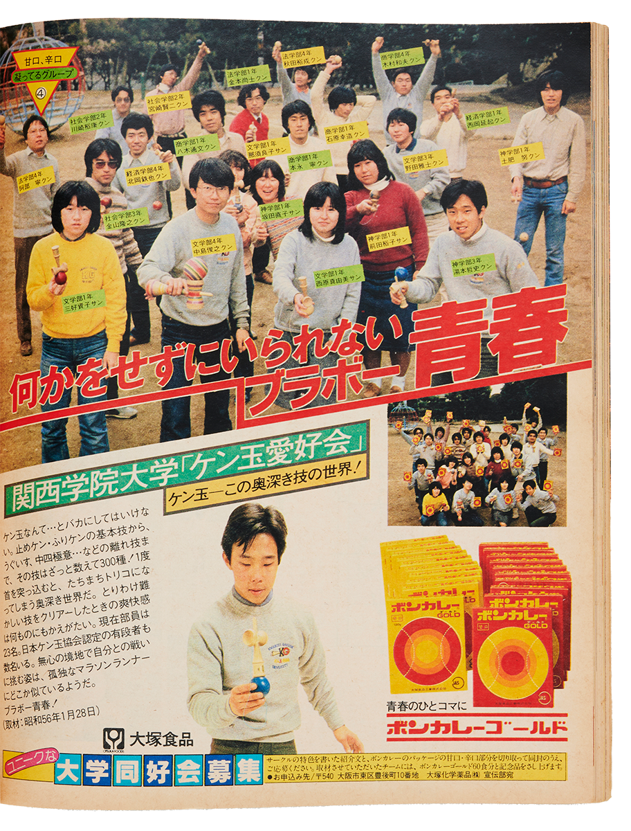 そんなお揃い服の人気を象徴するのが80年頃の『POPEYE』にたびたび出稿されている〈ボンカレー〉の広告。「関西学院大学」ケン玉愛好会や、「立教大学」易学研究会など、さまざまな大学のクラブ・同好会に着目するこの企画では、かなりの確率でお揃い服を着用している学生たちを目にすることができる。