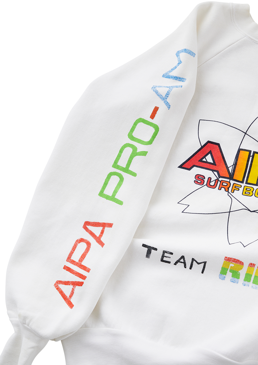 変わって白のトレーナーは〈アイパサーフボード〉の国内シェイパーを務めた手塚延幸プロの私物だ。袖に自身で”PRO-AM”とプリントしているのだが、コンテスト時に会場にいるスペクテーター(観客)たちとのファッションに差をつけるため、自らプロであることを主張したのではないかと思わずにいられない。