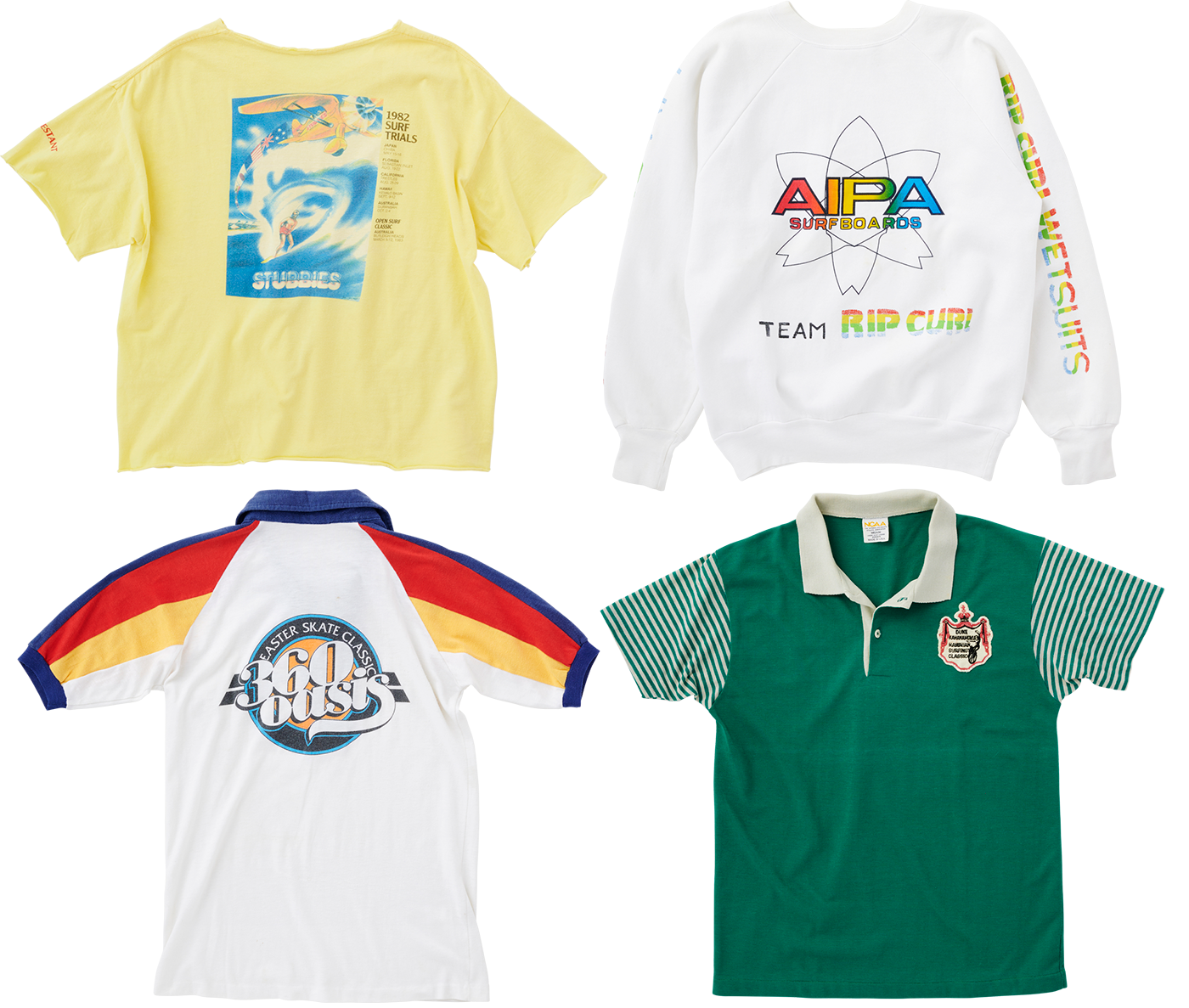 デザインの効いた伸縮性のあるテニスポロに、スケートボードやモトクロス用の肘当て付きメッシュジャージ、ベースボールジャンパーやサーファーのためのボードショーツだってそう。ワスレチック期はそれらの“競技服を街でファッションとして着る”という動きが大きく加速した時代だった。もちろんアスレチックウェアそのものの起源はずっと以前に遡る。しかし、現代のスポーツウェアに見られる、ファッション性も兼ね備えた2WAY仕様の礎は、間違いなく昭和50年代に築かれたと断言したい。