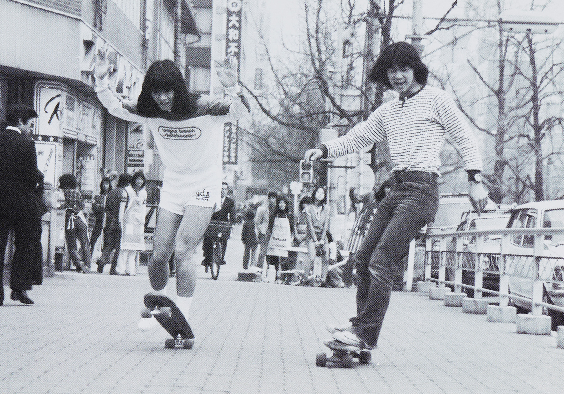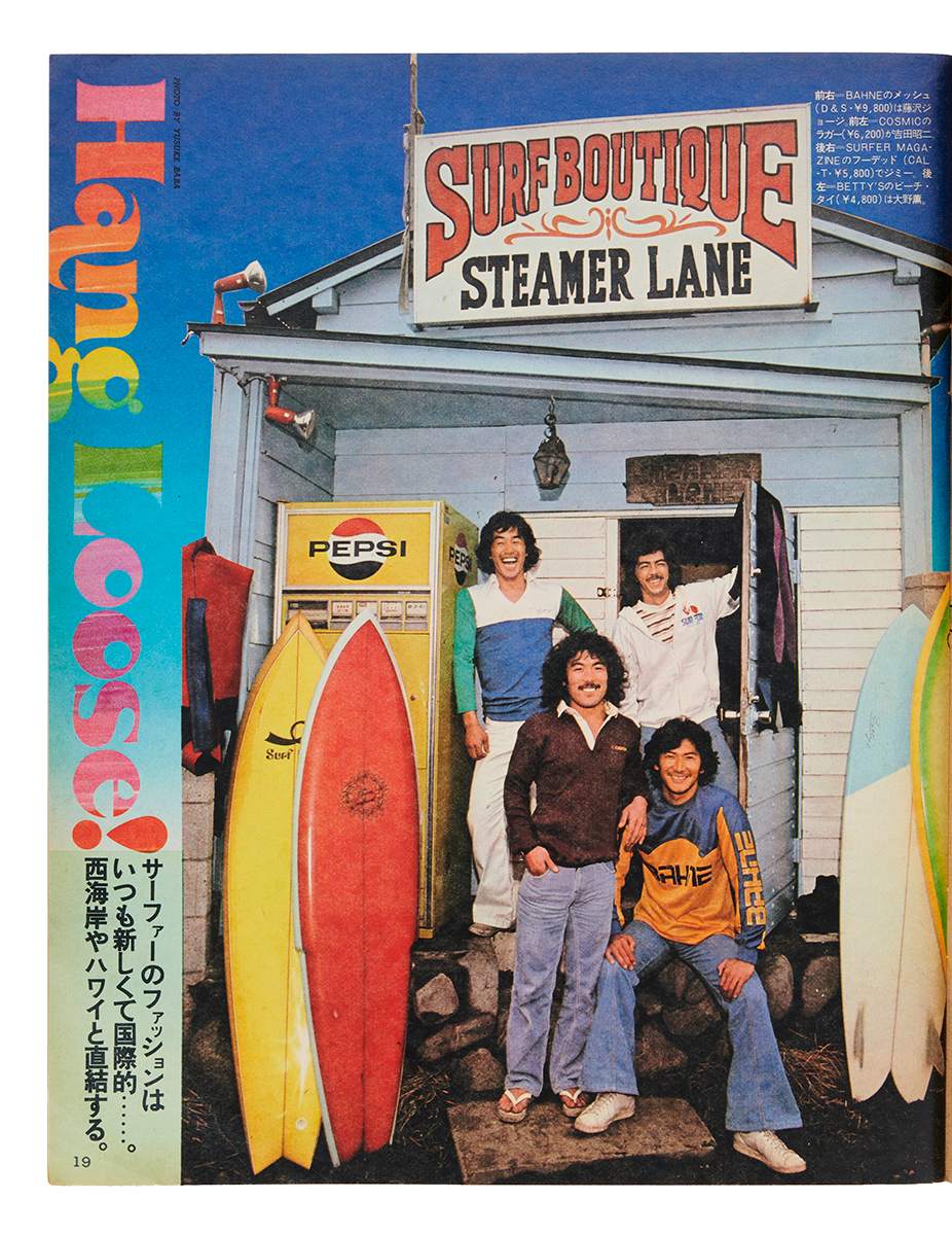 1977年『POPEYE』6号より。茅ヶ崎「サーフバム」の藤沢ジョージさんが〈べイン〉のスケートボードウェアを着ている。