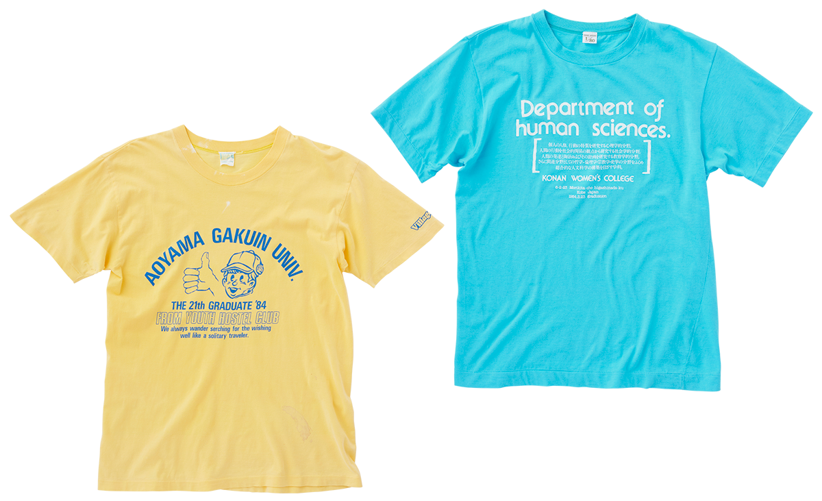筆者の所有する「青山学院大学」ユースホステル部のTシャツのイラストは、初期『POPEYE』を支えたイラストレーター本森隆史さんによるもの。同じカラーリングのスタジアムジャンパーに”○○大学テニスクラブ”といったワッペンを施すのもお決まり。〈アンクルボブ〉社など、お揃い服を作るメーカーが続々登場したりもして、恩恵を受けた企業も少なくない。