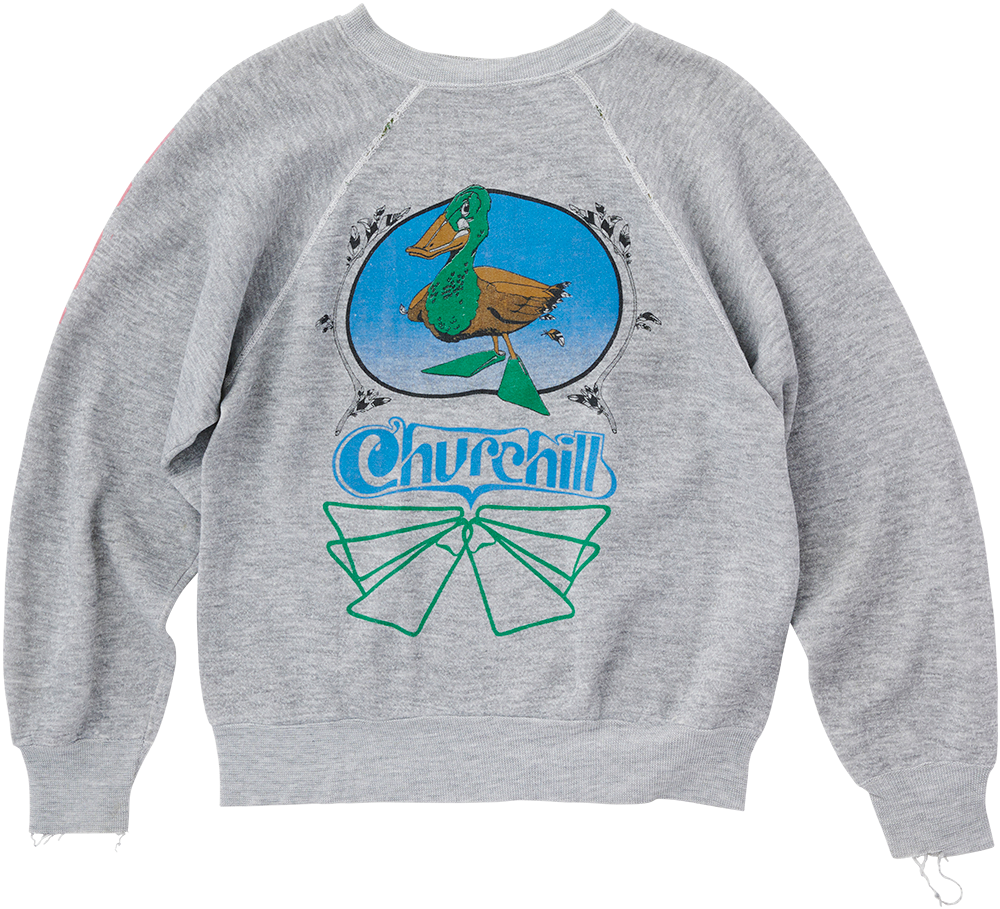鎌倉のサーフショップ「イージー」で店番をしていた筆者の先輩が、無断で自分のトレーナーに店のロゴをシルクスクリーンした名付けて”勝手にユニフォーム”。スイムフィンメーカー〈チャーチル〉のトレーナーなのも良い。