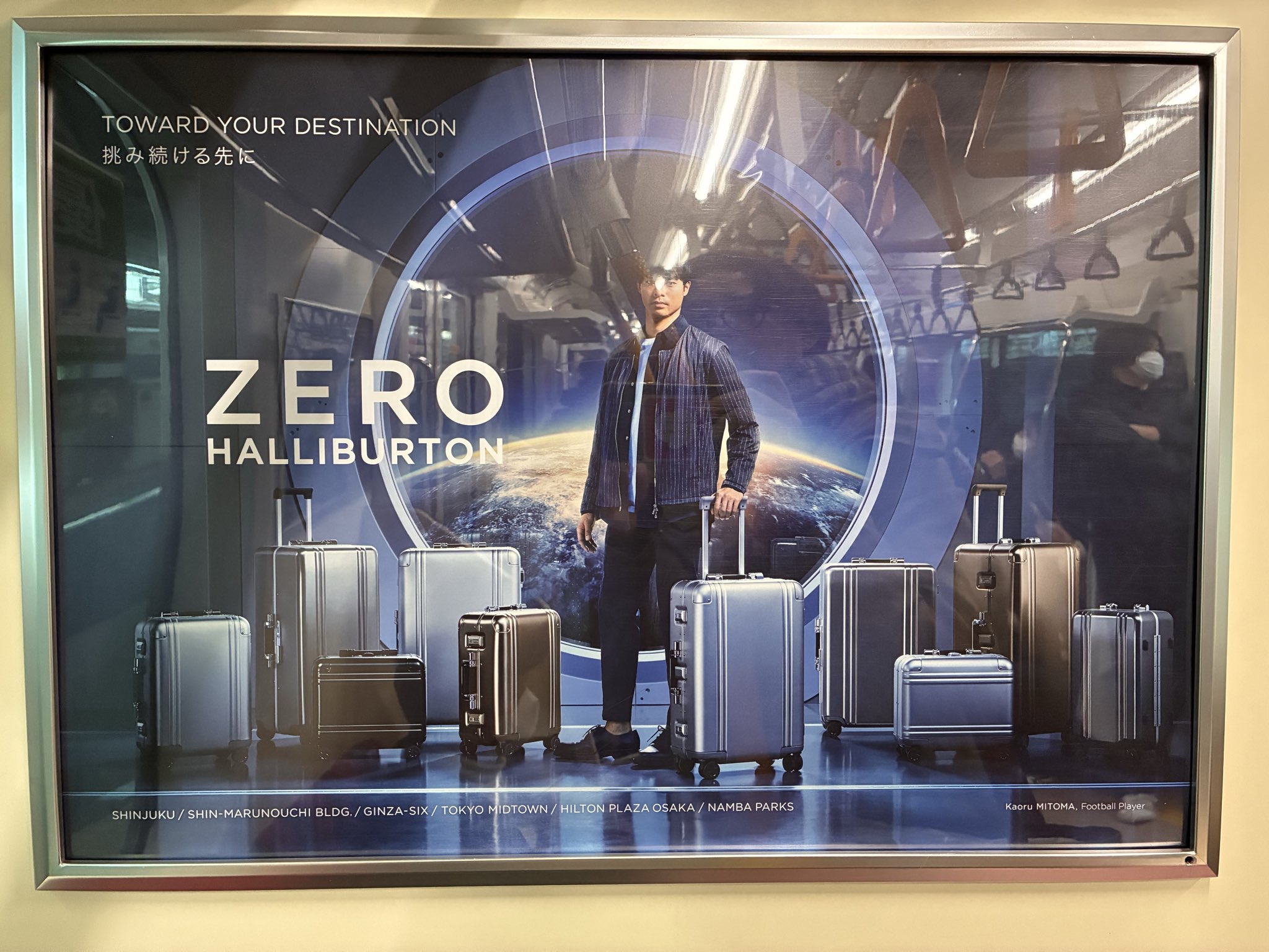 3月が異動と移動の季節だな、と感じたのが、〈ゼロハリバートン〉というスーツケースブランドの広告です。NASAの月面採取標本格納器として採用されたという歴史を持つ、耐久性と機能美を謳っているブランドですが、プロサッカー選手の三苫薫がブランドアンバサダーに起用されています。遠征で世界各地を飛び回る三苫の背景には、宇宙船と思しき空間の丸い窓越しに、地球が映し出されています。高みを目指し、未到の地を目指す究極の「出世」のイメージと言って差し支えないでしょう。高級スーツケースを手に入れることは、早く、遠く、高く移動できる手段・特権を手中に収めることに等しい、と暗示しています。こちらも、青と白を基調にした画面構成で、遠目にも男性的・男性に訴求する広告だと感じます。