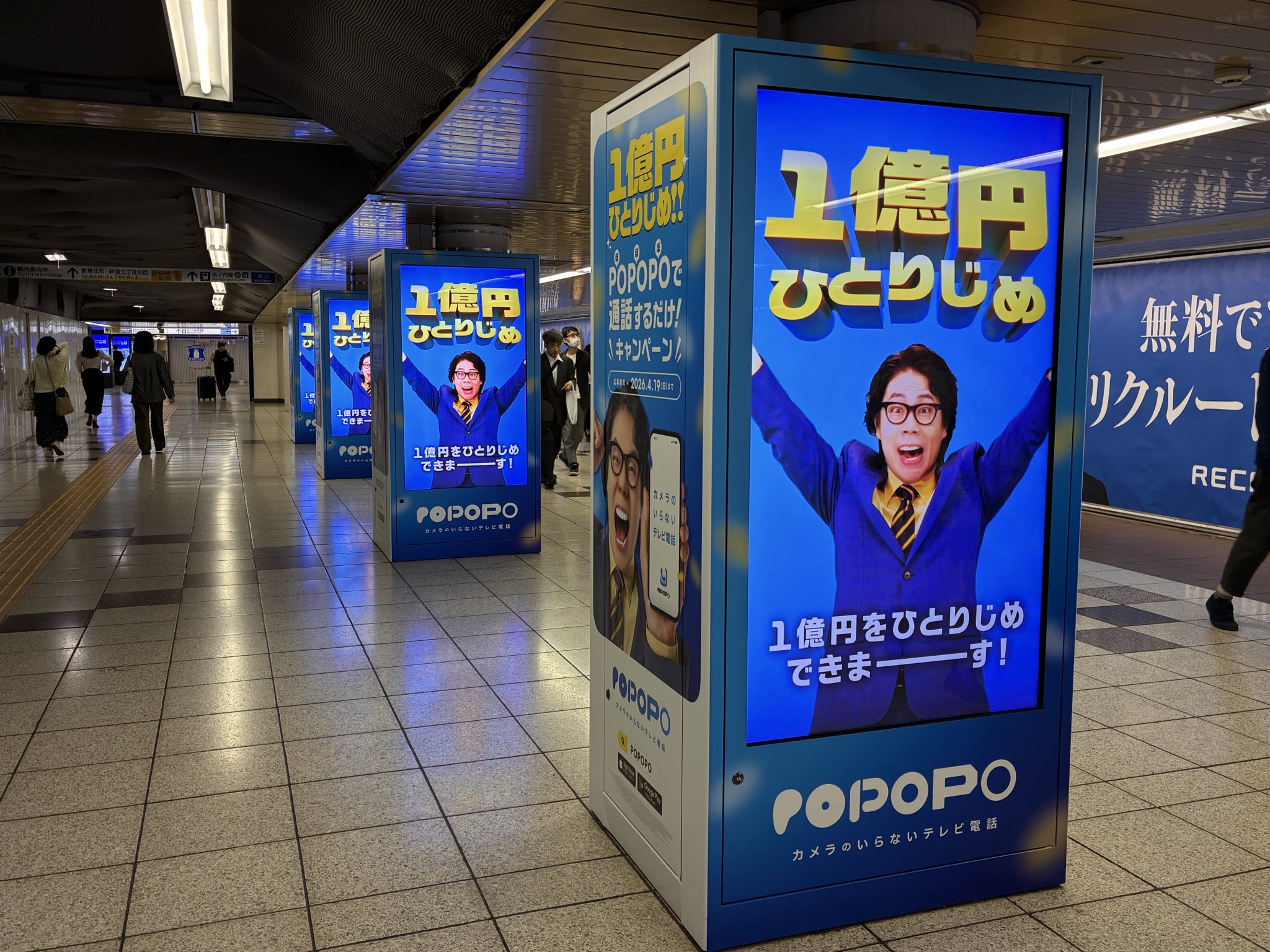 その後、同じ広告を新宿駅の通路で見かけたのですが、デジタルサイネージに令和ロマンの髙比良くるまを起用したPOPOPOという通信サービスの広告が映し出されていました。こちらもスーツ姿で青と白のコントラストがはっきりした画面。転職エージェントと通信サービス、宣伝しているものは異なりますが、「スーツ姿の男性が何かを勧めている」という表現に違いはなく、タレントを入れ替えても成立しそうです。通信・IT・転職関連の広告と同様に、金融・不動産関係の広告もスーツ男性が登場するものが多く、世の中のインフラ、基幹となる仕組みを司っているのは男性だと主張しているようです。