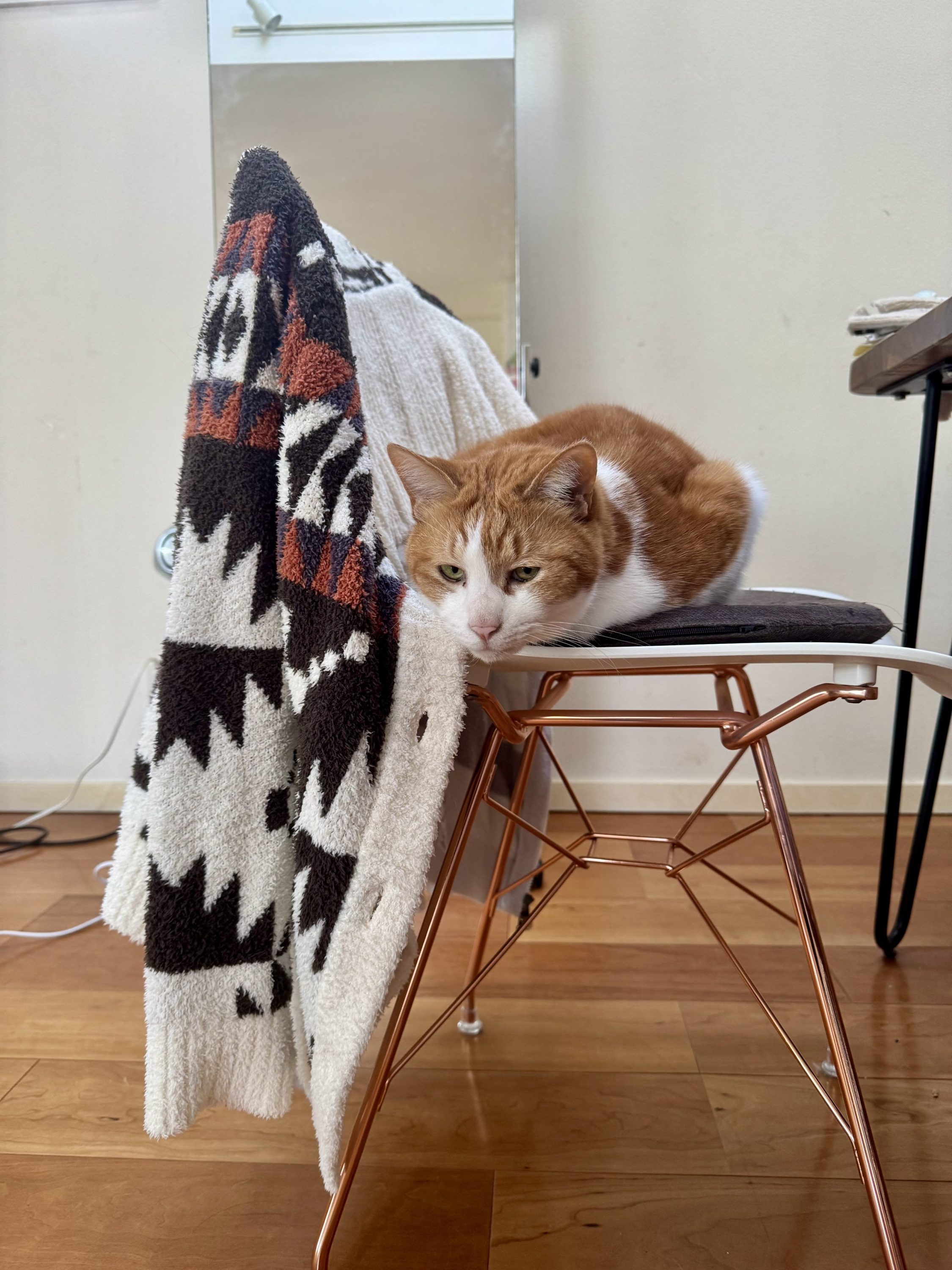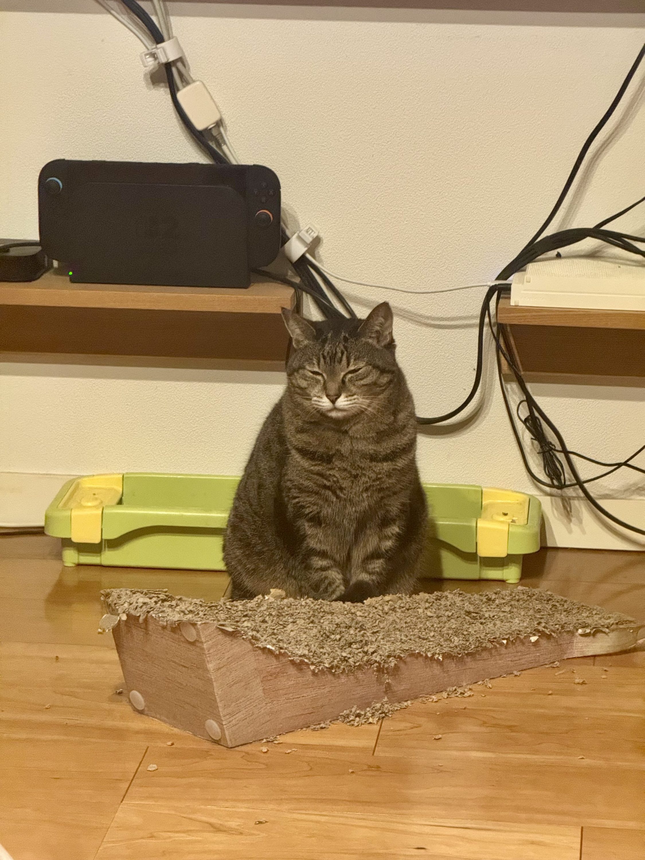 猫が爪研ぎに爪先を引っかけて、爪を目一杯まで伸ばしてから納める一連の行為は、例えると武士が刀を抜刀して納刀する動きのようなもので、爪研ぎをバリバリやるのは抜刀(シャッ!)、納刀(チン!)の動きを繰り返しているようなモノです。これは傍目に見ると相当ヤバい行為なのかもしれません。シャッ!、チン!、シャッ!チン!、シャッ!、チン!、…はぁ、うっとり♡ ですから。ヤツらが夢中で爪研ぎをしてる最中は眼がどこも見ていない色合いになっているのもヤバさを増幅させています。また、実は後ろ足の爪研ぎはしないというところも、武器のメンテナンス観点の裏付けでもあります。自分的にはですが。