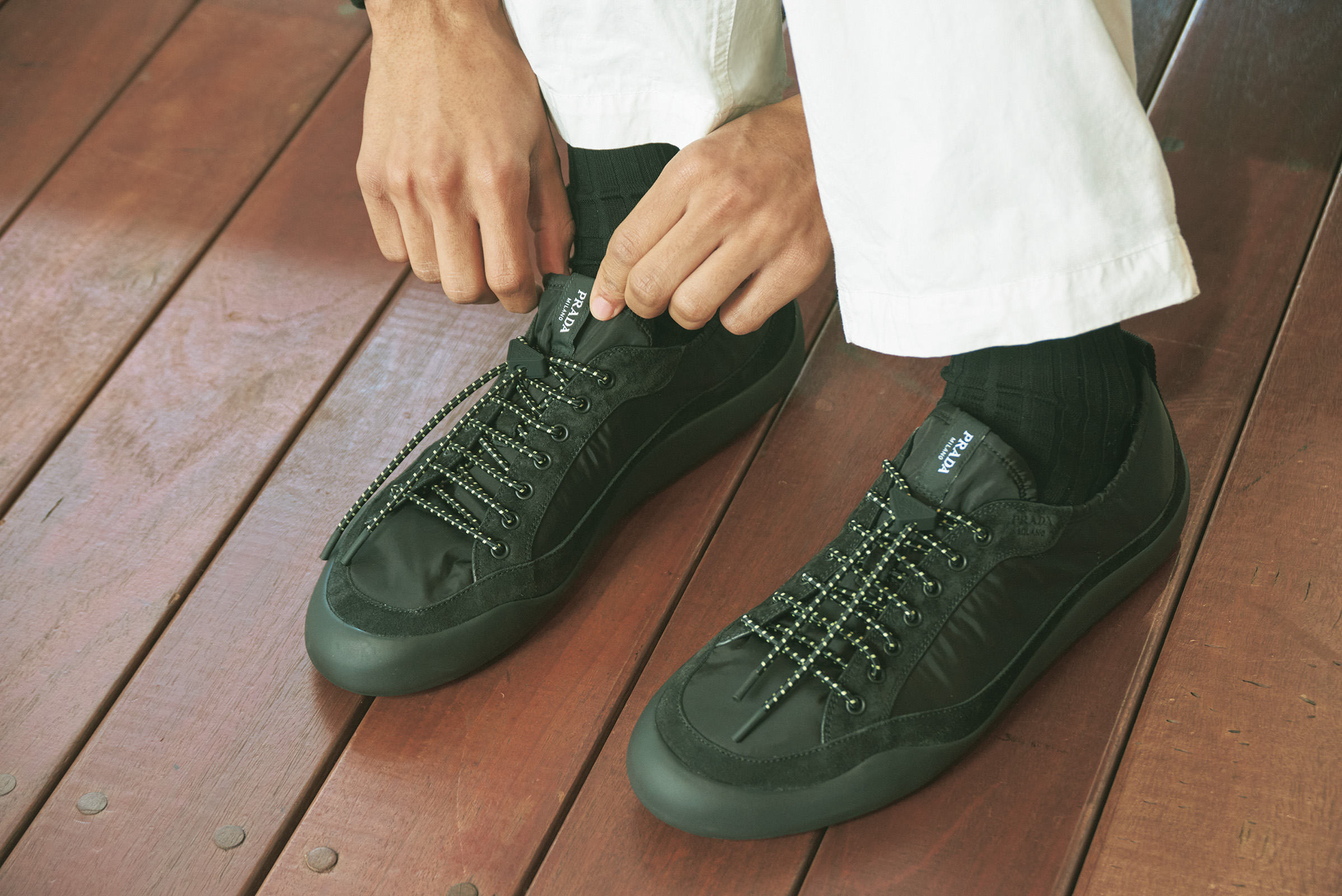 アウトドア感のある意匠とシティ的なムードが融合したスニーカー「プラダ スピードロック」。Re-Nylonをまとい、端正な“顔付き”の新作。メッシュ素材バージョンも。Re-Nylonバックパック¥616,000、スニーカー「プラダ スピードロック」¥165,000※ともに予定価格、ソックス 参考商品(すべてプラダ)
