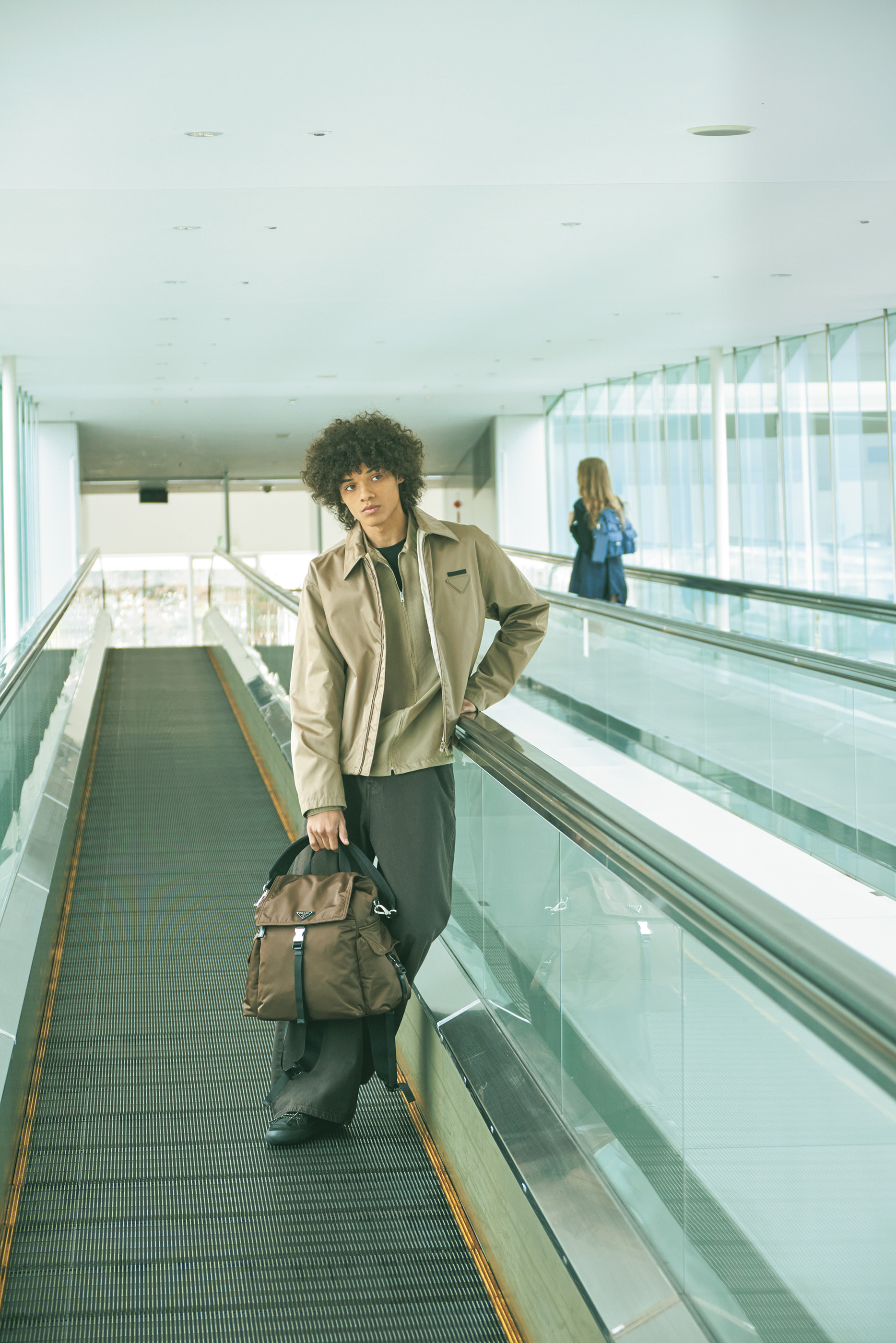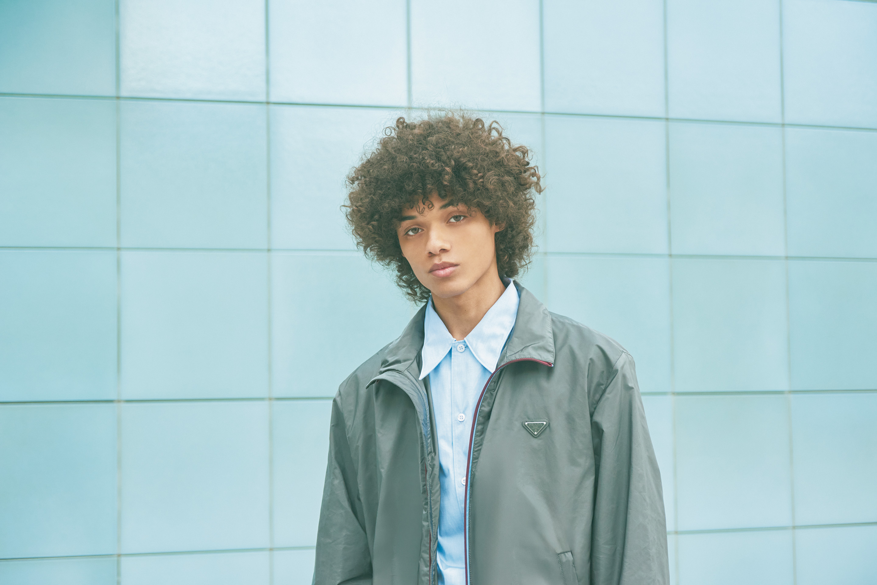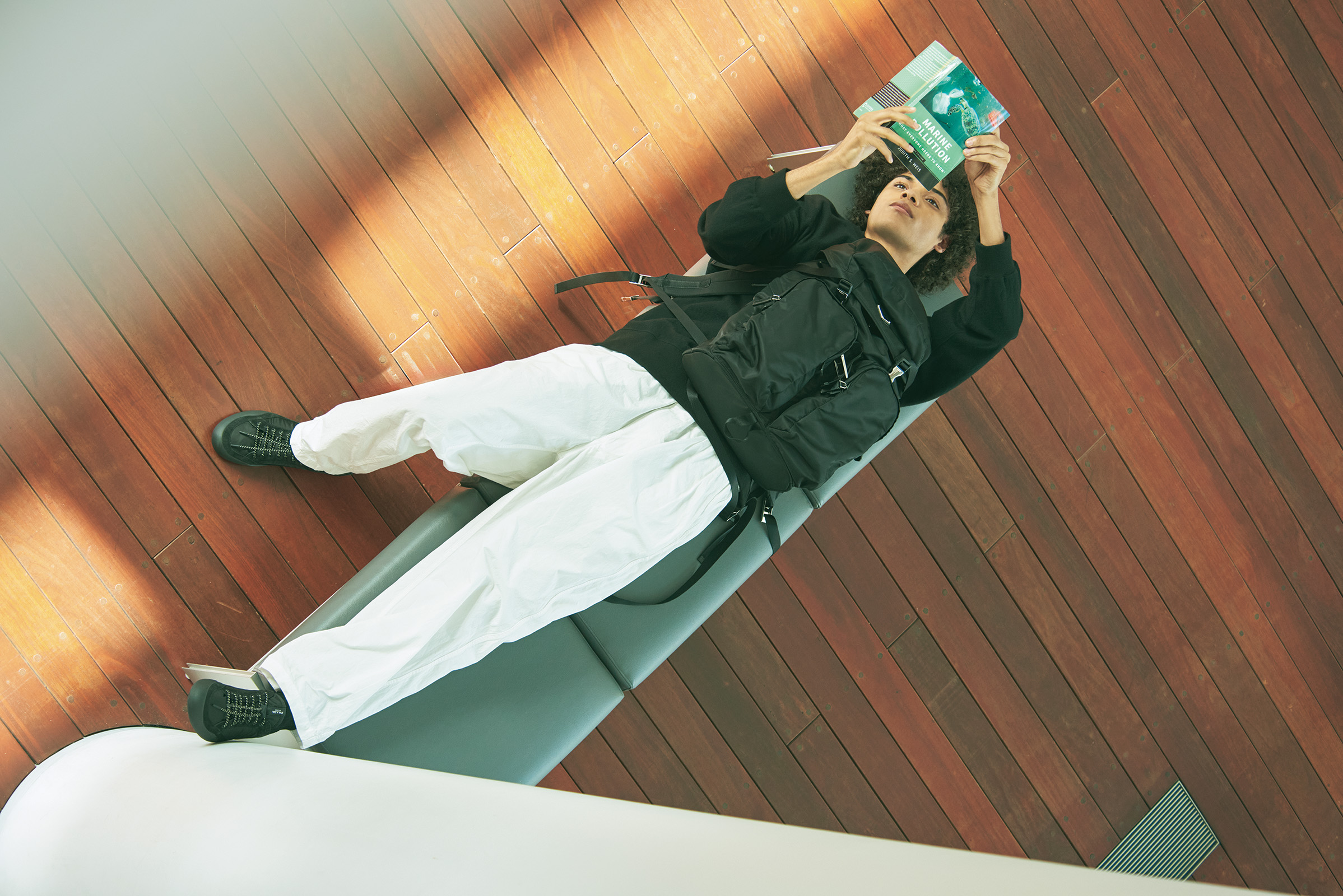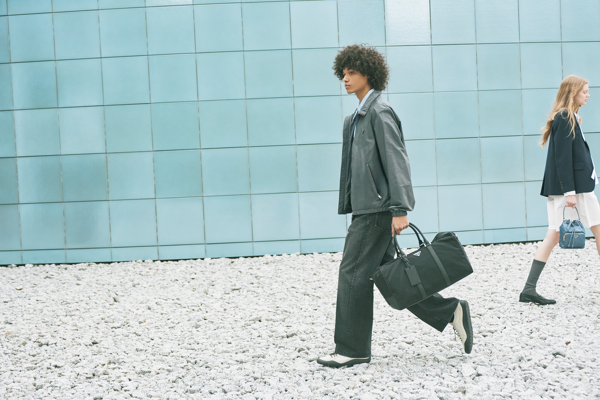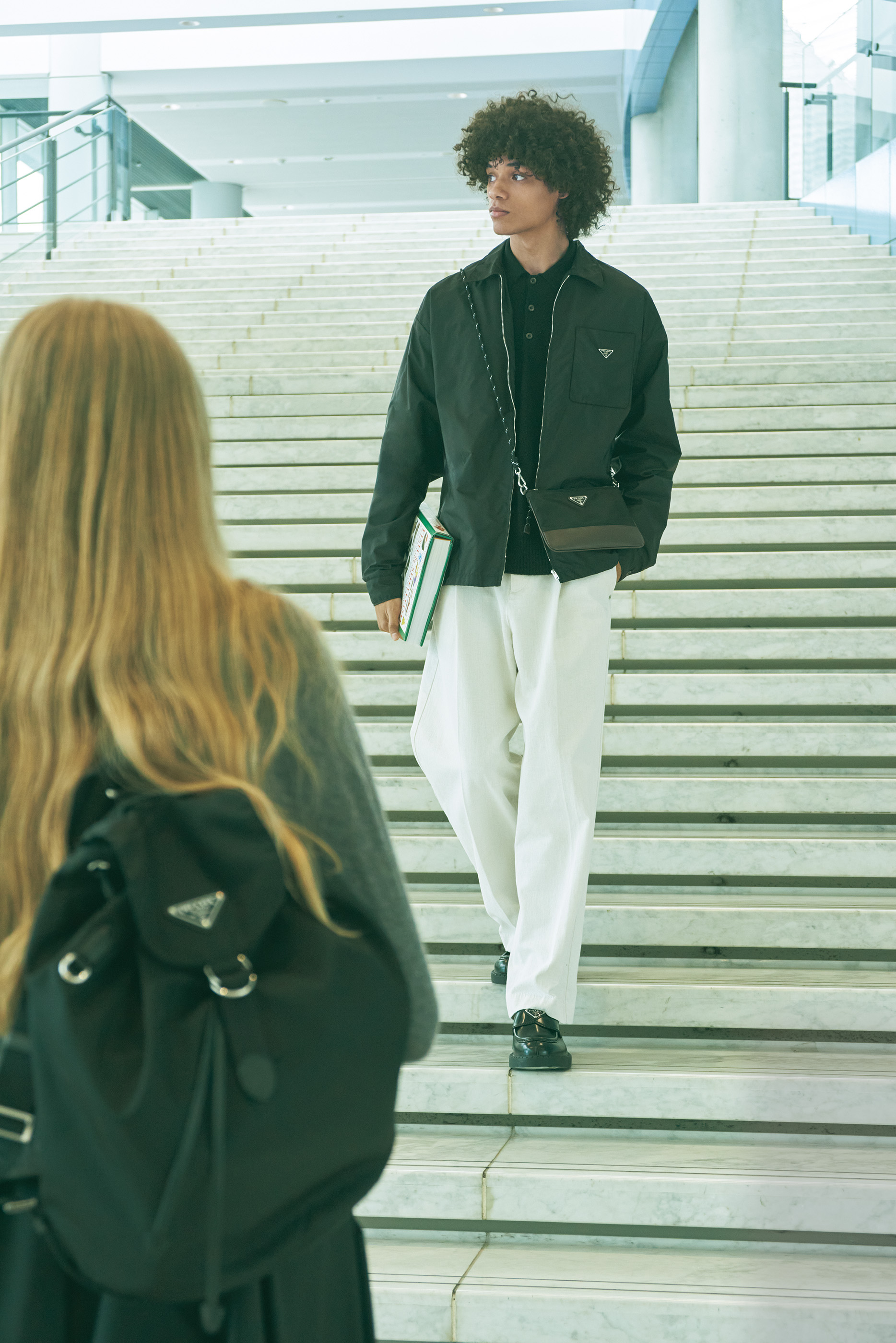 雑誌『GINZA』と連動して、〈プラダ〉のアイコン的存在の「Re-Nylon」(リナイロン)にフォーカス。テーマは、キャンパスを舞台に海洋学を専攻する二人。お互いにサステナブルに関心がありながら、なぜかすれ違う男女のストーリー。Re-Nylonジャケット¥434,500、同バックパック¥484,000、スニーカー「プラダ スピードロック」¥165,000、シャツ¥258,500、Tシャツ¥122,100※すべて予定価格(すべてプラダ)