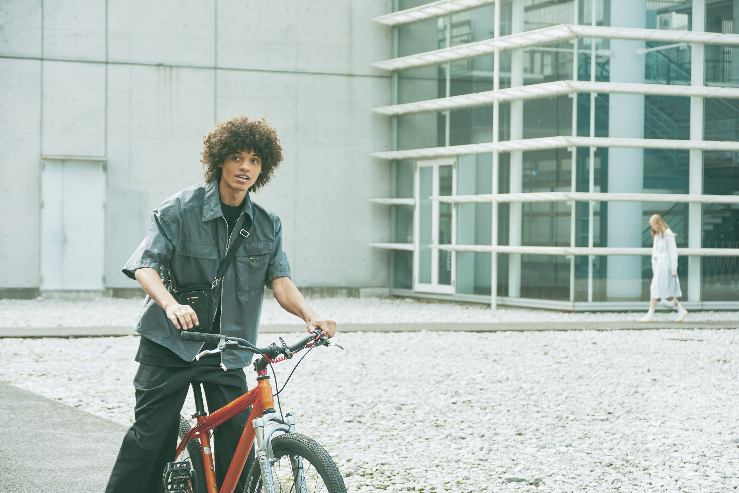 自転車でクルーズしながら、思いを馳せるは「Re-Nylon」と海洋保全のこと。この2つの関係性をもっと知りたい!Re-Nylonシャツ¥245,300、同スマートフォンケース¥179,300、ポロシャツ¥105,600、Tシャツ¥122,100※すべて予定価格(すべてプラダ)