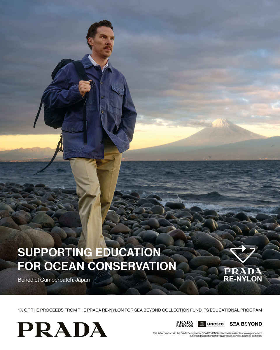また、〈プラダ〉はユネスコ政府間海洋学委員会(UNESCO-IOC)と協力し海洋環境保護と持続可能性を啓発する教育プログラム「SEA BEYOND」 をサポート。Re-Nylonコレクション収益の1%が、このプログラムに寄付されている。今季のキャンペーンには、俳優のベネディクト・カンバーバッチを起用。日本で撮影したムービーには彼に加えて、さかなクンがさかなクン探究隊と共に登場し、海洋保全への思いを語っている。動画を通して、日本の海の美しさを再確認。そして、海洋保全のために、微力ながらも自分ができることへと心を寄せることだろう。