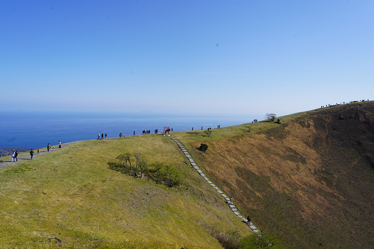 ちなみに今着いたのは伊豆の大室山。実はドライブの撮影でも訪れたんですが、白バックで撮ったんか? ってくらい頂上が濃霧で、泣く泣く写真を小さくしました。それが今日は見てください、この海と山の稜線! 今から誌面に合成できますか?