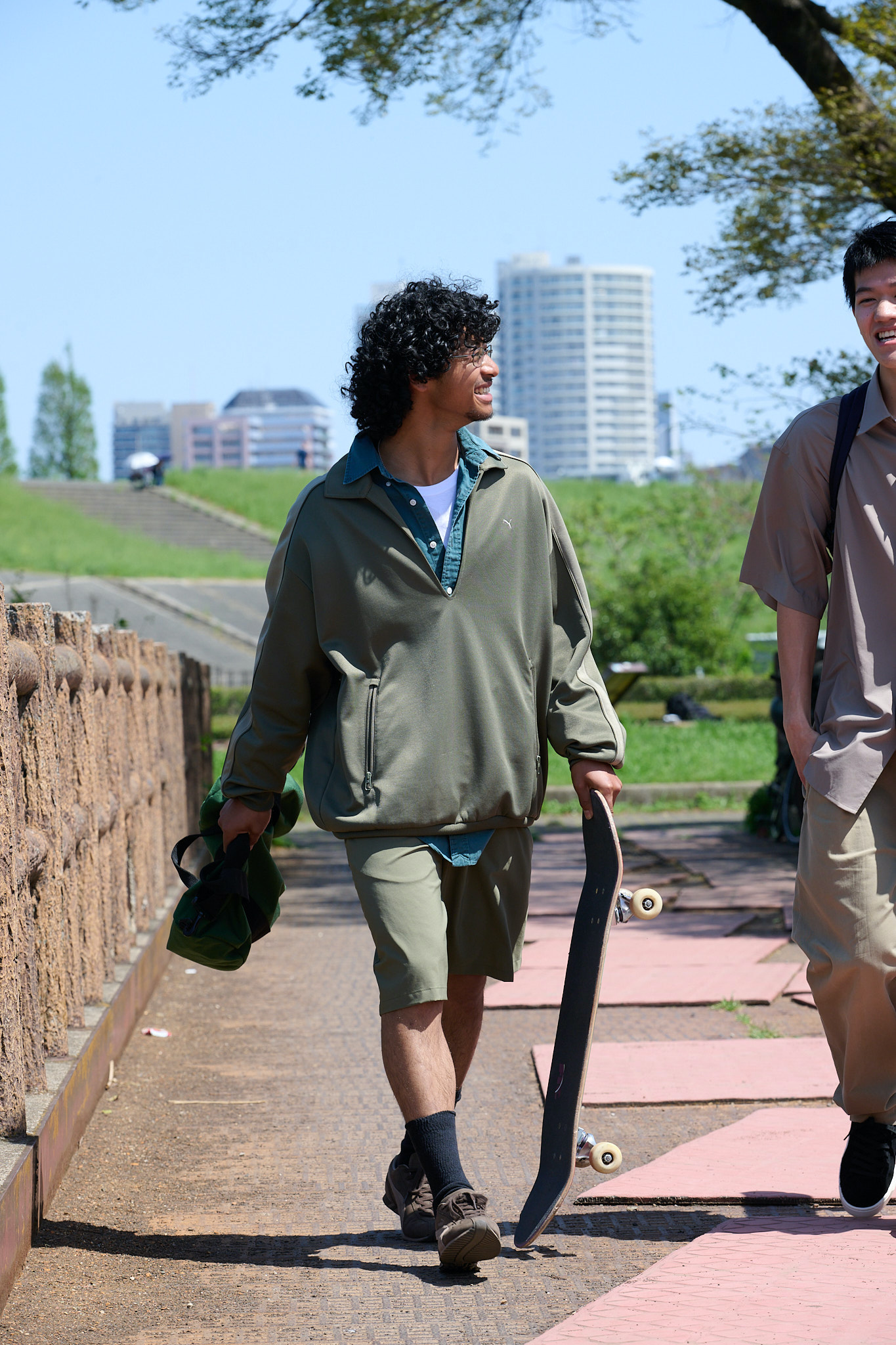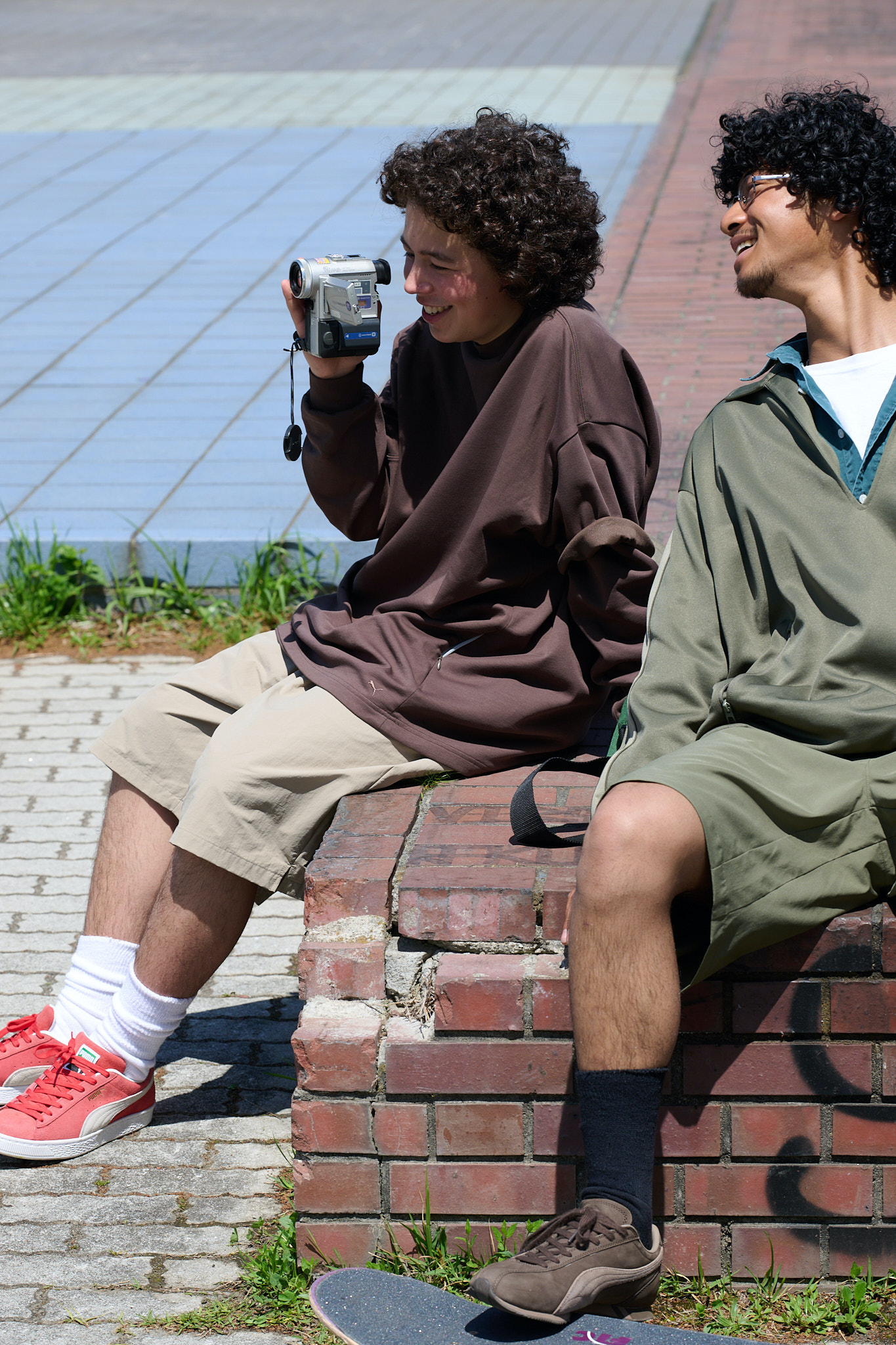「PROJECT PUMA PLUS.」はスモーキーなトーンが多いのだけれど、重ね着するとその良さがわかる。ロングスリーブの上にショートスリーブTをオンしても、自然にまとまること。色を変えて遊ぶのもいいけれど、今日はちょっと大人っぽく見せたくて、あえて同色のブラウンでレイヤードした。