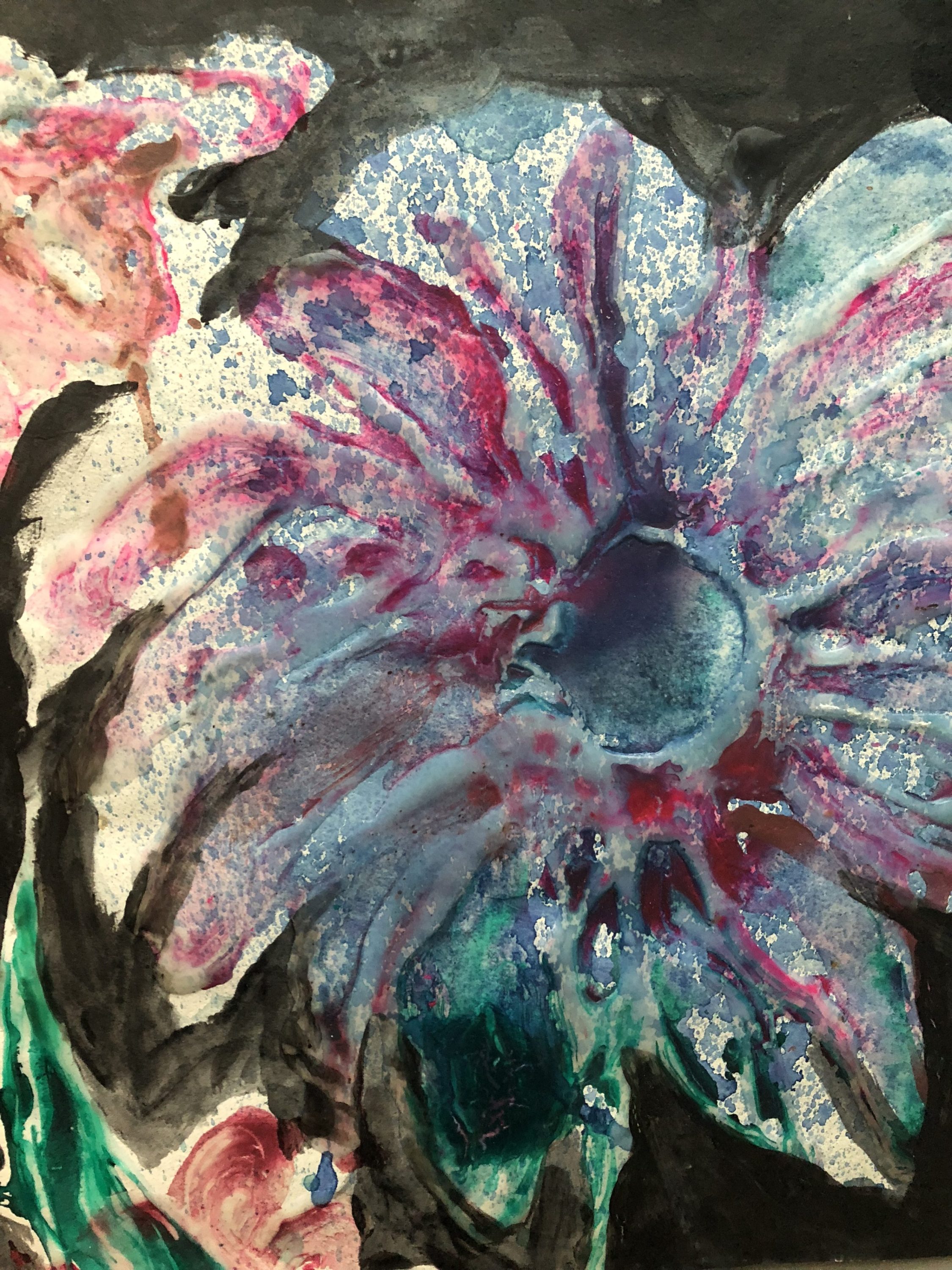 最初は防水紙に油クレヨンで手袋をして指でゴシゴシ伸ばして描いていたのですが、すぐに破れてしまい指の肌荒れが酷くなり…それからアクリル絵の具へ変えまして「素手で描く」いまの順子スタイルが生まれました。