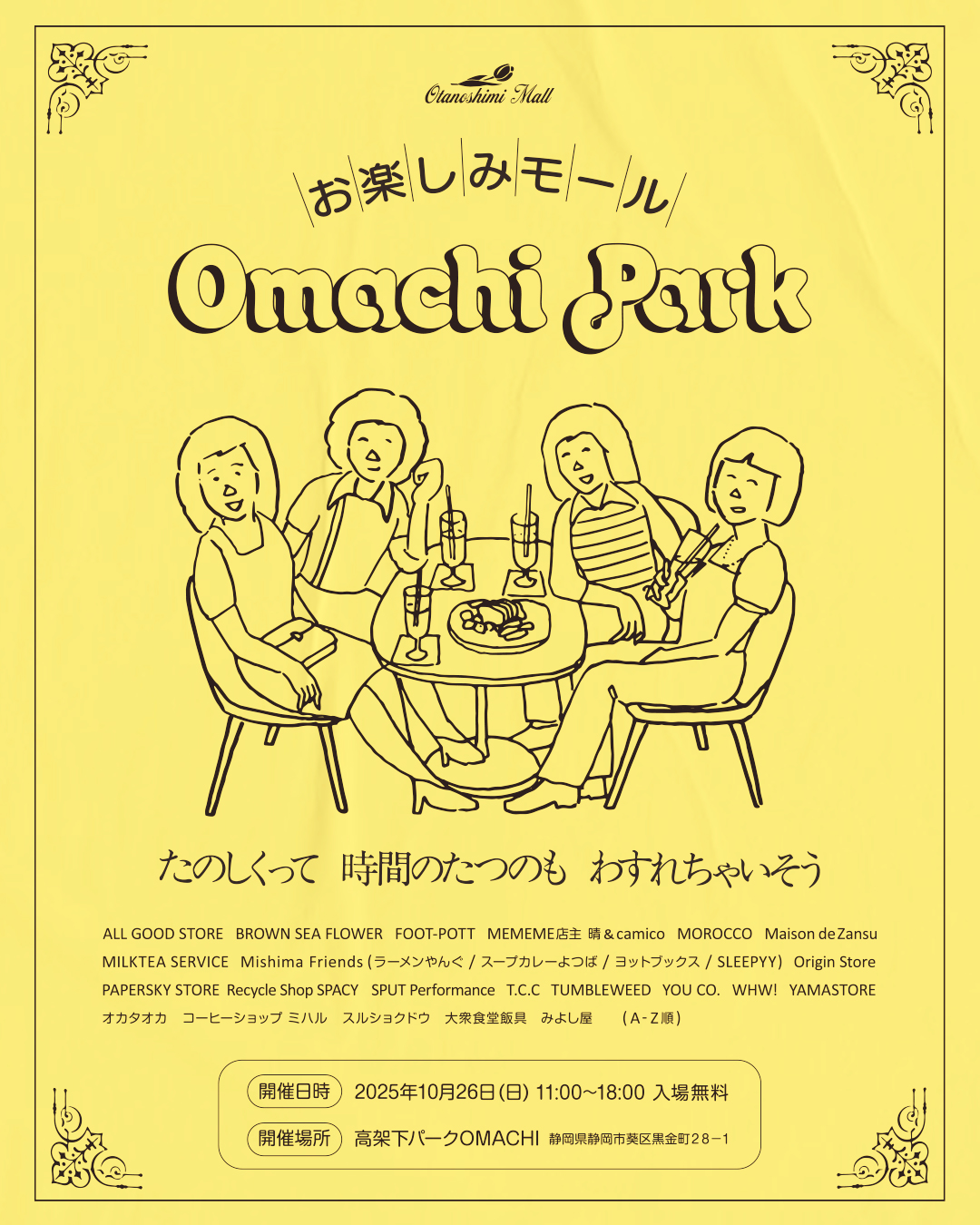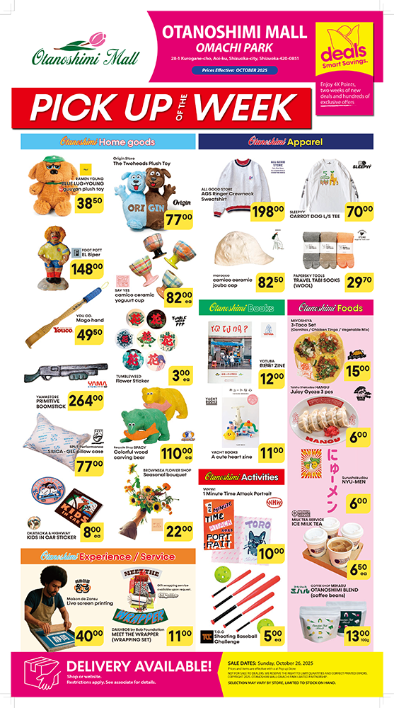 なんとも素敵な名前のイベントが10月26日に開かれる。静岡駅の高架下のイベントスペース「OMACHI」で開催の「お楽しみモール」はオリジナルのアパレルや雑貨、そして美味しいフードやドリンクを一気に楽しめる欲張りなイベント。計16店舗の中にはポップで可愛いオリジナル雑貨を販売する大阪の『ALL GOOD STORE』や静岡の「新(珍)感覚リサイクルショップ」『RECYCLE SHOP SPACY』、浜松のホットスポット『コーヒーショップ ミハル』など興味そそられるお店が多数! また、僕らのPOPEYEカーの内装を手掛けてくれた内装や設営などの職人マツケンさんと『ALL GOOD STORE』店主ファンキーさんによるクリエイティブユニット『You co.』も出店。このイベントのために制作した折込チラシ風メモリアルポスターを投げ銭で販売するそうだ。当日、欲しいものが見つかるか、それは行ってからのお楽しみ!