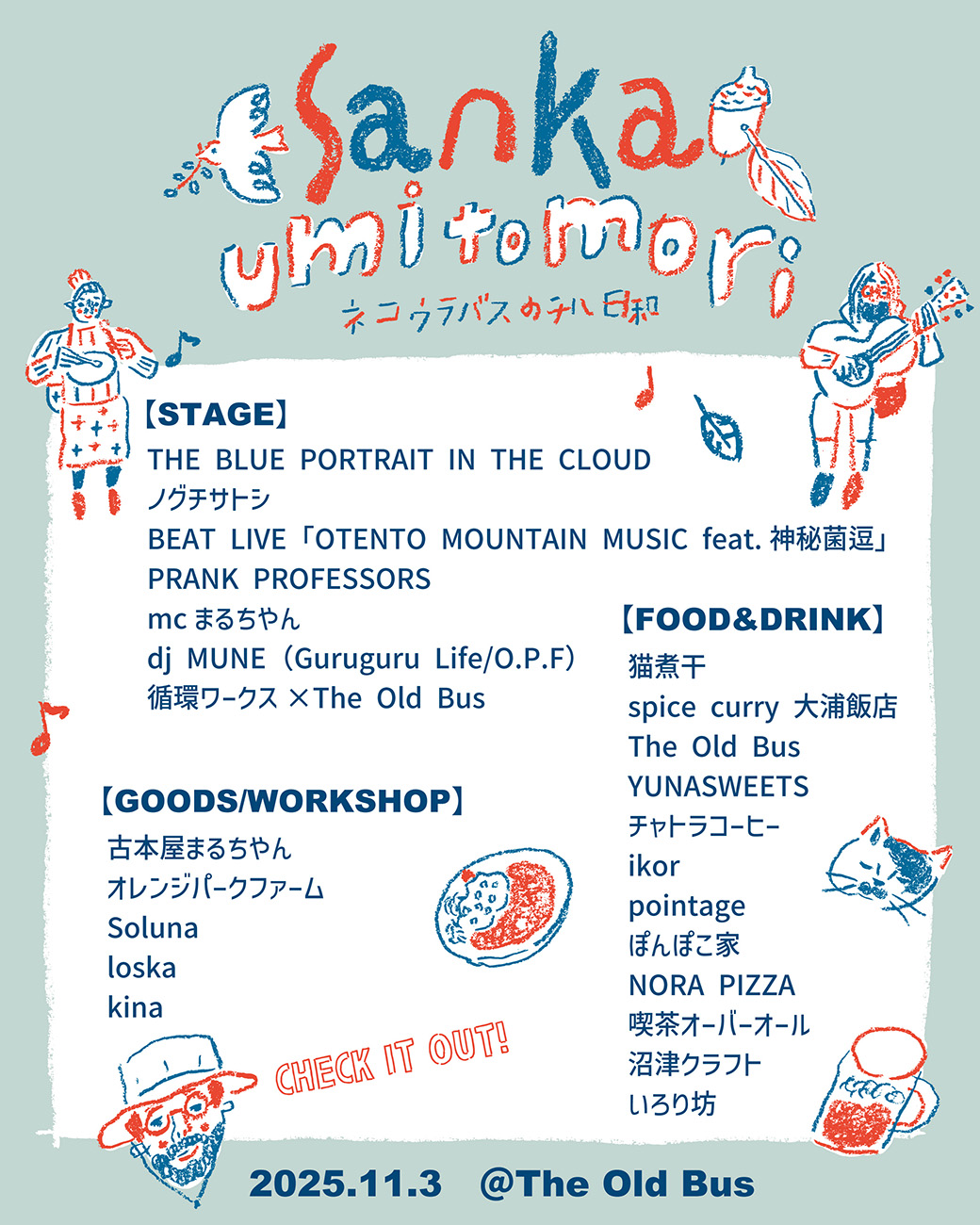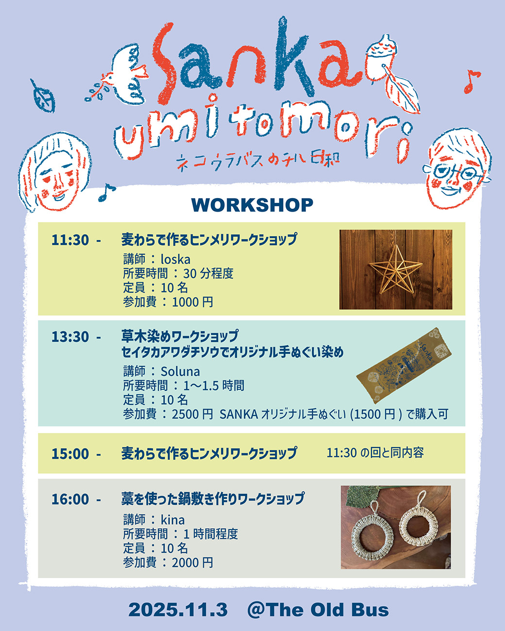 なんとイベント会場となるのはこのバスがある駿河湾のほとり。こちら『The Old Bus』という名でリノベーションされた古いバスを予約制のバーとして営業し、裏山にはキャンプスペースを持つチルな場所。今回ここで開かれるイベント「SANKA海と森」は音楽・食・アートなど様々なジャンルを堪能できる。音楽のステージにはジャズやロックを演奏するバンドやDJなど7組が集い、フード&ドリンクブースには絶品創作料理を提供する『猫煮干』やスパイスカレーの『大浦飯店』、沼津のクラフトビール『沼津クラフト』など計12組が集う。そして麦わらで作る北欧飾り「ヒンメリ」や藁で作る鍋敷き、草木染め体験などのワークショップも充実。(当日は沼津駅までの帰りの送迎便が出るので、お酒を飲んでも大丈夫)。『互いを「讃歌」し、共に「参加」し、豊かな「山河」あり』をテーマに掲げる「SANKA海と森」に参加しよう!