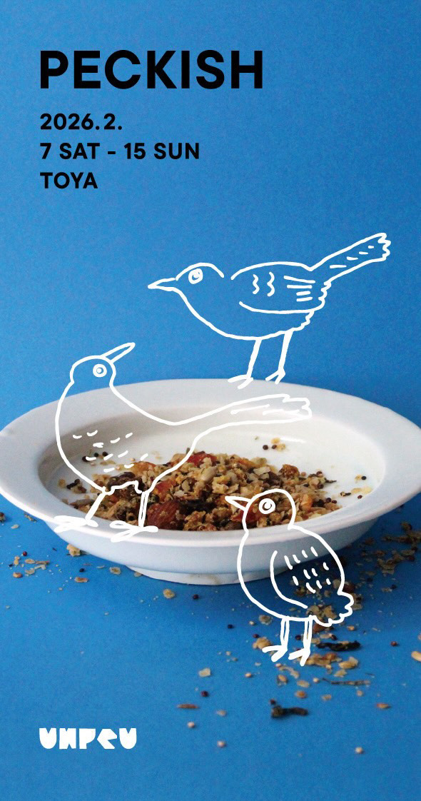 目白台『塔屋 TOYA』で開催中の展示のタイトル“Peckish”は、「小腹がすく」という意味の、可愛らしい響きを持つ英語。もともとは、鳥が口ばしでついばむように少しずつ食べることを指す“Peck”から派生した言葉だ。この響きには、生きるための切迫感ではなく、三度の食事の合間にふと訪れるお楽しみのような、自由でのんびりとしたムードがある。