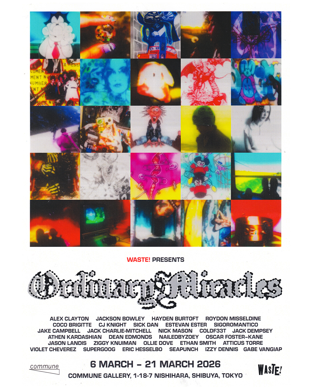 幡ヶ谷の西原商店街にある『gallery commune』で、ロンドンのカルチャーショップ/スペース『WASTE!』がキュレーションするグループ展 “Ordinary Miracles” が開催中。「日常の奇跡」と題した本展には、写真家、ペインター、グラフィックデザイナー、ネイルアーティストなど、ジャンルもキャリアもさまざまな29名が参加している。自身もグラフィックデザイナーとして活動するロイドン・ミッセルダイン、ファッションブランド〈Life Is Unfair〉を手がけるジャック・チャーリー=ミッチェルという2人のファウンダーも名を連ねている。会場では展示作品のほか、ポスターや、これまでWASTE!で使われてきたグラフィックをまとめたzineも販売。WASTE!ならではの鋭い審美眼としなやかな視点が交差する展示だ。
