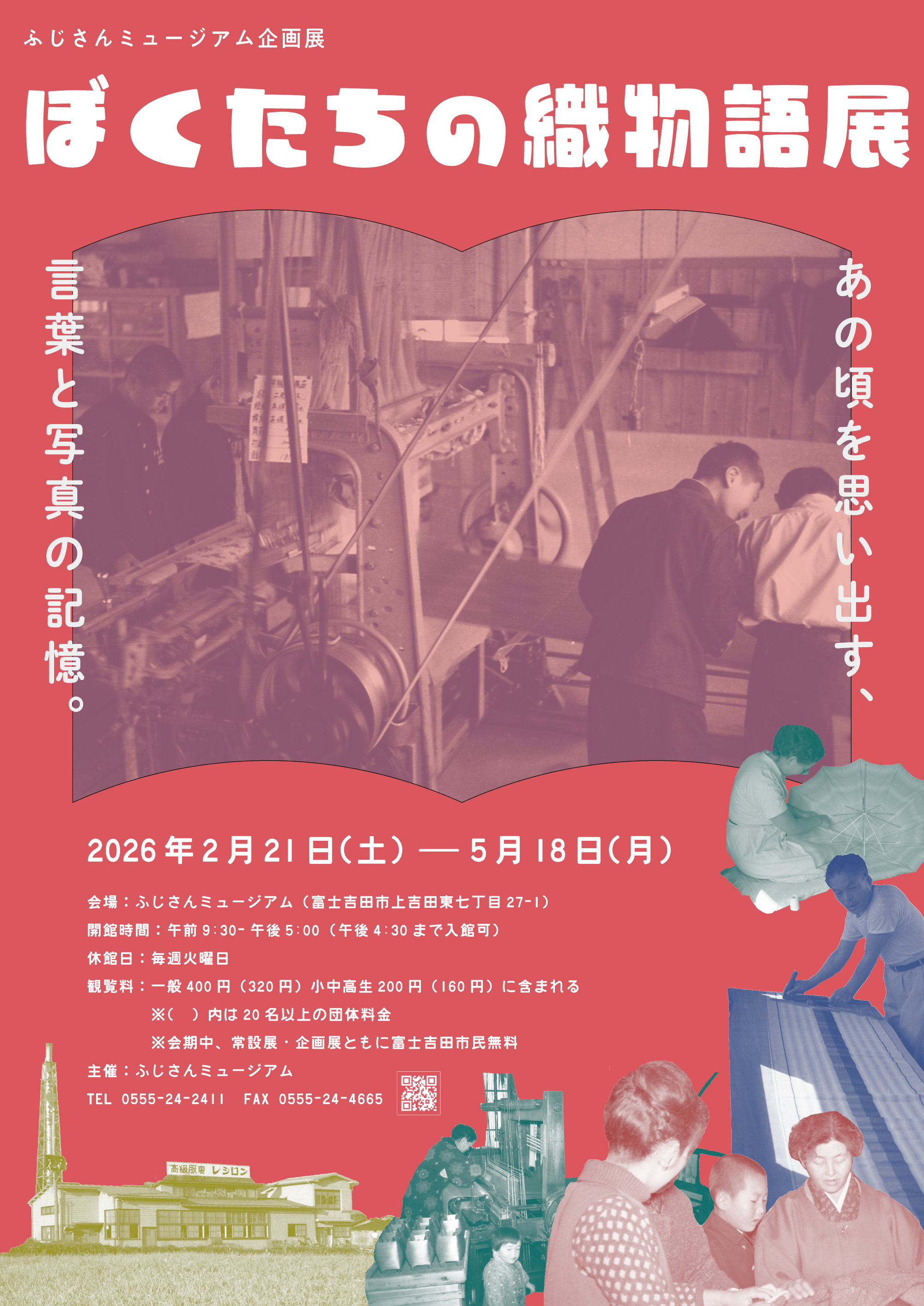 かつて織物産業を支えてきた家屋に隣接する小さな工場のそばには、その営みを間近で見つめる子どもたちの姿があった。この展示では、主に昭和期の子どもたちの言葉、記憶、史料写真を手がかりに、この地域に息づいていた織物のある暮らしを、エピソード、写真、漫画を通して紹介する。