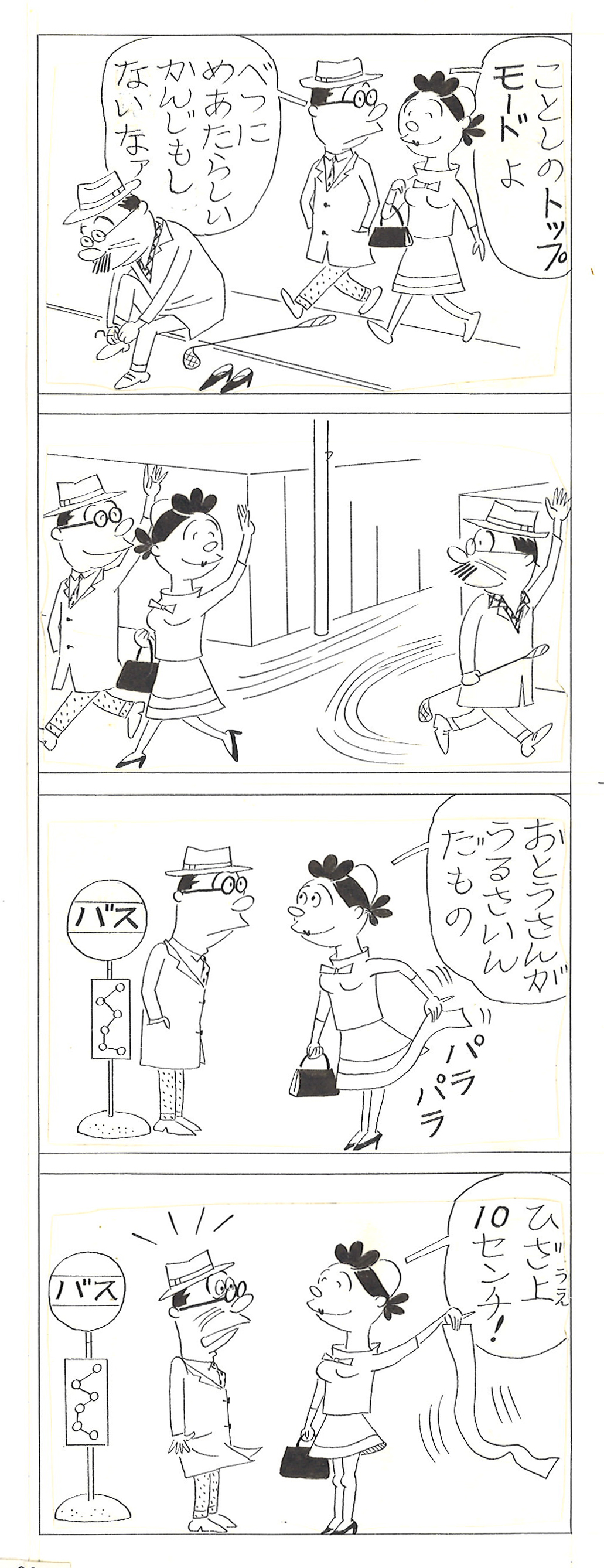 ♪オサカナクワエタドラネコ〜、なんて聴こえてきたら、日曜日のお決まりの時間の合図。テレビの前に座ればあっという間に“あの頃”にタイムスリップできる。お馴染みのテレビアニメ作品でも昭和の日常を存分に味わうことができるが、原作の漫画では当時の暮らしぶりの描写がさらに細やか。特に流行に敏感なサザエさんの装いは、当時の最新のスタイル。節々には彼女自身の小粋なこだわりが表れていて、なんともお洒落なのだ。本展には、『サザエさん』の約200点の原画や関連資料が展示され、連載期間である1946年から1974年までの日本のファッションの移ろいの様子が伺える。さらには作者である長谷川町子さんの着こなしも紹介されるといい、今なお色褪せることない華やかなおしゃれ文化を垣間見ることができる。ちょうど爆発的な流行りを見せていたミニスカートを父である波平の目を盗みつつはきこなし、「ことしのトップモードよ」と語るサザエさん。お茶目すぎて、いつの時代もやっぱり目が離せないのだ。